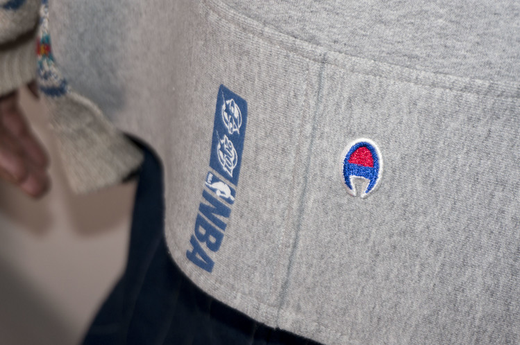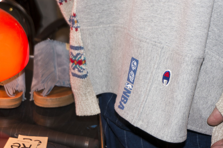 East oklm, The hand remake garments로 Champion 스웻셔츠와 인디언 니트를 이용하여 재구성 된 상품. Champion 소매에 있던 로고 자수를 뒤판으로 옮겨 브랜드의 아이덴티티를 그대로 반영하고 있으며, 에스닉한 문양을 가진 인디언 니트와 재구성하여 만들어 졌습니다.