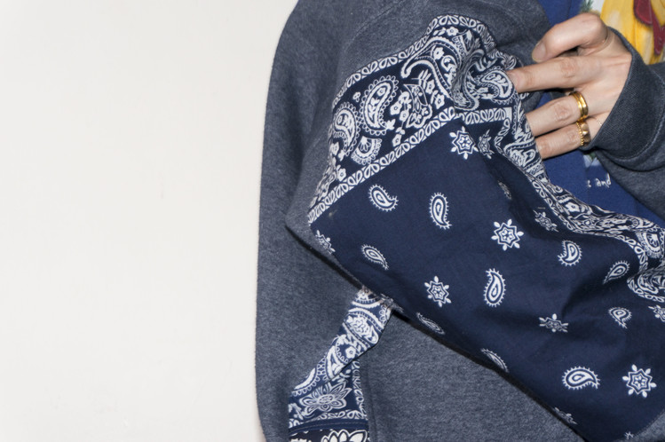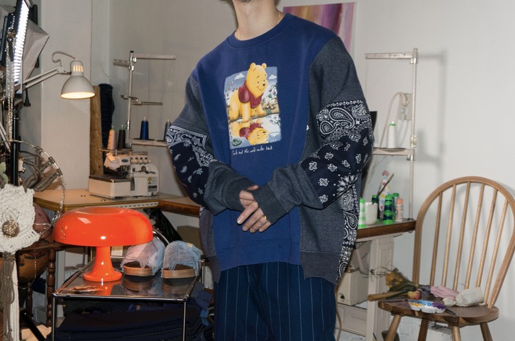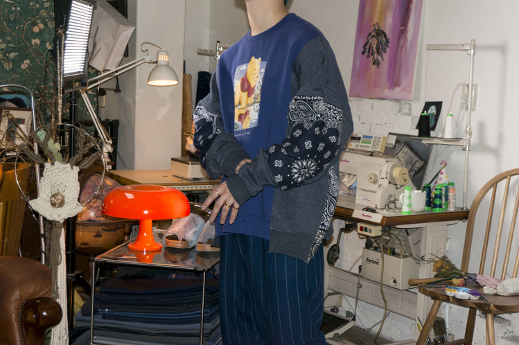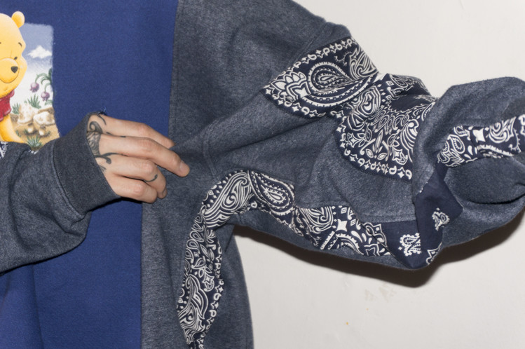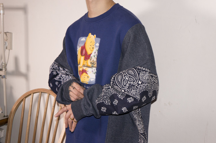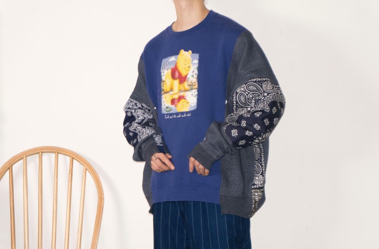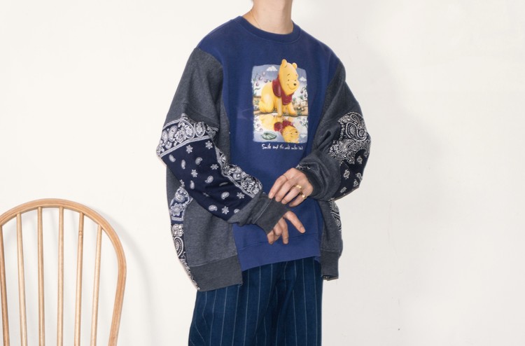 East oklm, The hand remake garments로 귀여운 Pooh 프린트가 인상적인 Disney 스웻셔츠와 Champion 스웻셔츠, 아메리칸 빈티지 스웻셔츠를 해체하고 재구성하고, 반다나로 포인트를 만든 상품. 색상의 톤 차이가 있는 네이비 색상의 스웻셔츠들을 해체하고 재구성하여 차이감이 보이도록 의도하고, 네이비 색상의 빈티지 반다나들을 이용하여 양쪽 소매와 옆을 채워 좋은 포인트를 만들었습니다.
