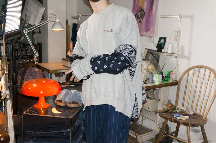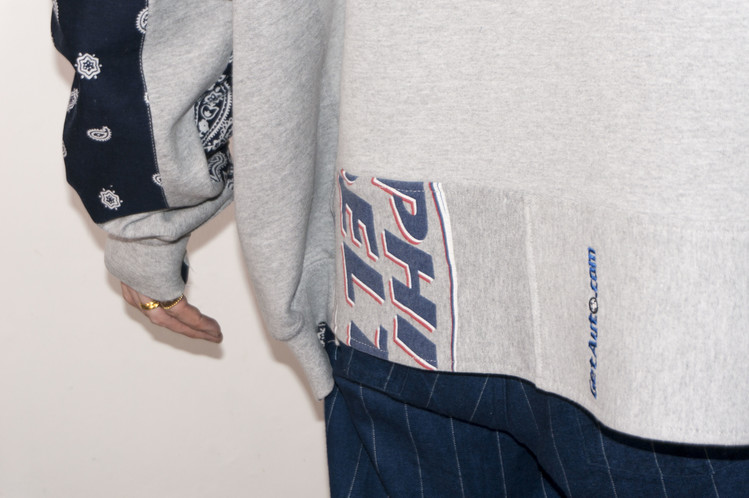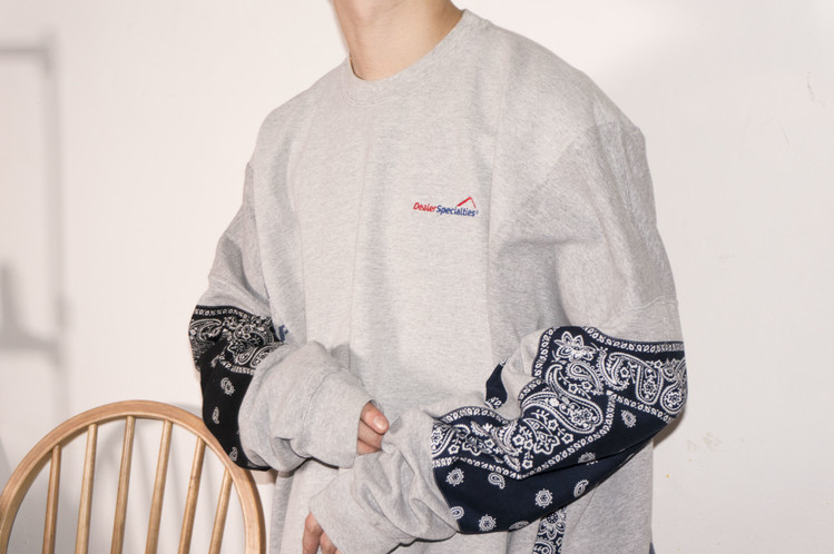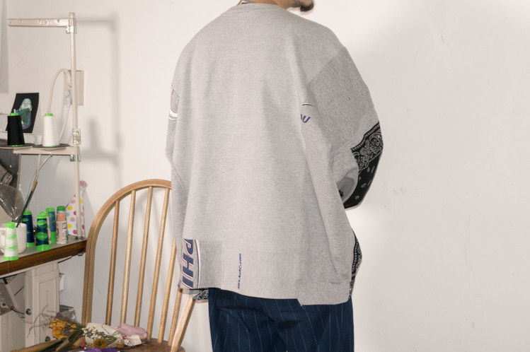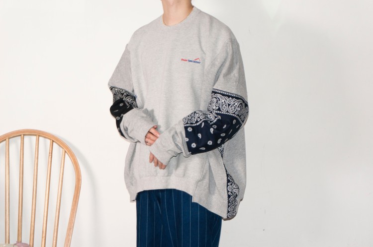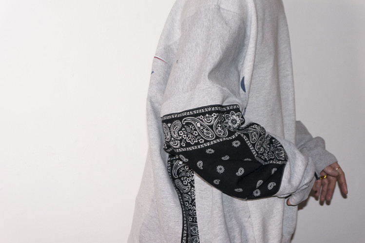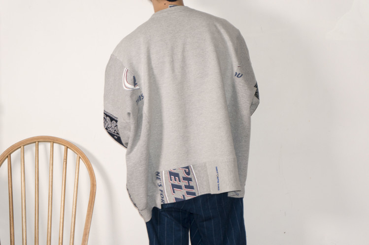 East oklm, The hand remake garments로 그레이 색상의 아메리칸 스웻셔츠들을 해체하고 재구성하고, 반다나 포인트를 확인할 수 있는 Landfill 스웻셔츠 상품. 비슷한 색상 톤을 가진 스웻셔츠들을 믹스하고, 조각난 프린트부분으로 뒤판의 길이감을 늘려줌으로써 보다 좋은 균형감을 가진 옷으로 완성 되었습니다.