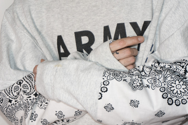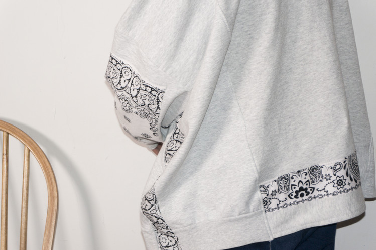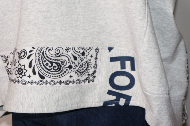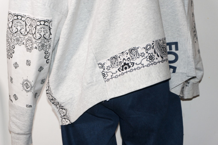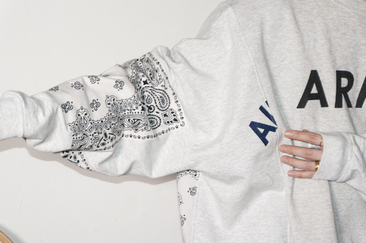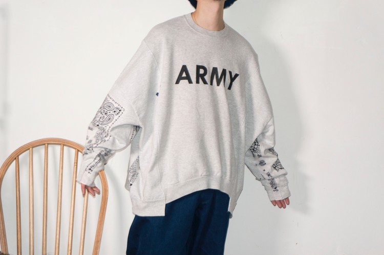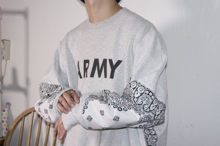 East oklm, The hand remake garments로 오리지널 US ARMY, US Air Force (made in USA) 스웻셔츠들을 믹스하여 재구성하고, 반다나를 이용하여 East oklm,의 Landfill 포인트를 만든 상품. 밝은 그레이 색상의 오리지널 US ARMY, US Air Force 심플한 나염을 볼 수 있는 스웻셔츠로 조각난 프린트의 조합과 화이트 색상의 빈티지 반다나 포인트가 자리 합니다.