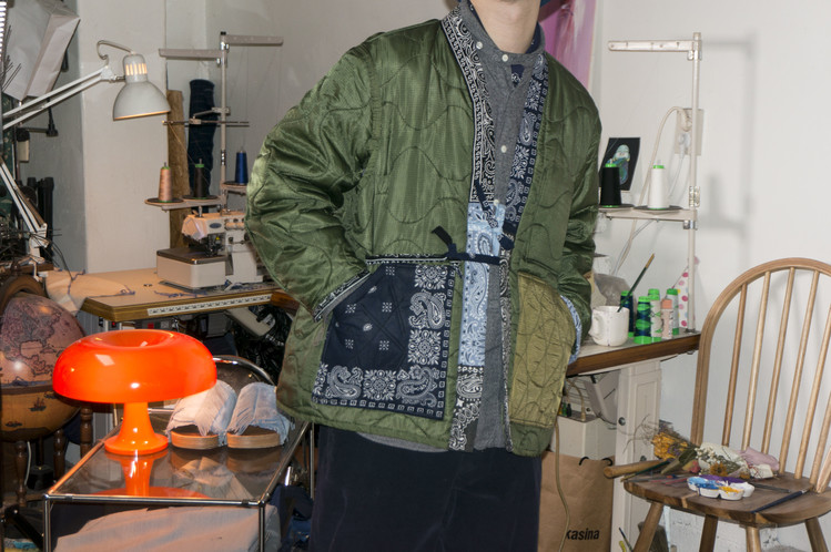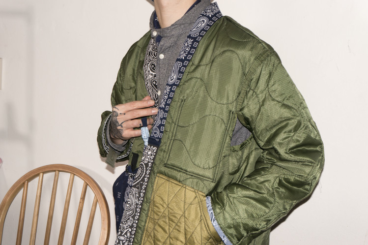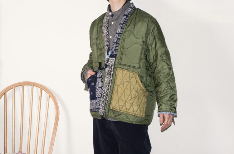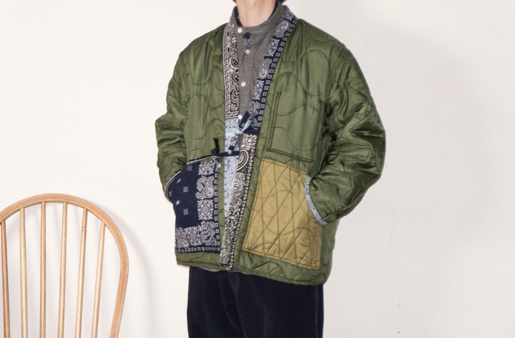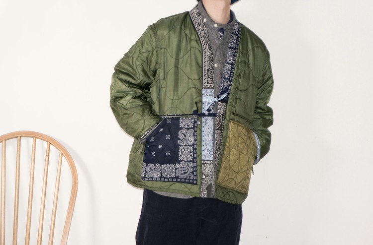 East oklm, The hand remake garments로 m65 liner를 바탕으로 반다나를 이용하여 완성되어진 상품. 동양적인 해석이 들어간 앞마이 부분은 다른 4가지의 반다나를 이용하여 각기 다른 패턴의 문양과 색상으로 표현되었습니다.