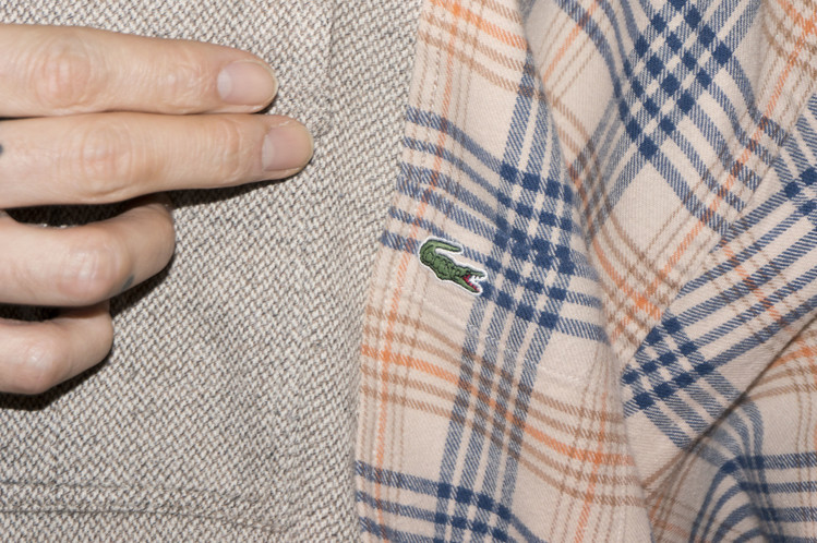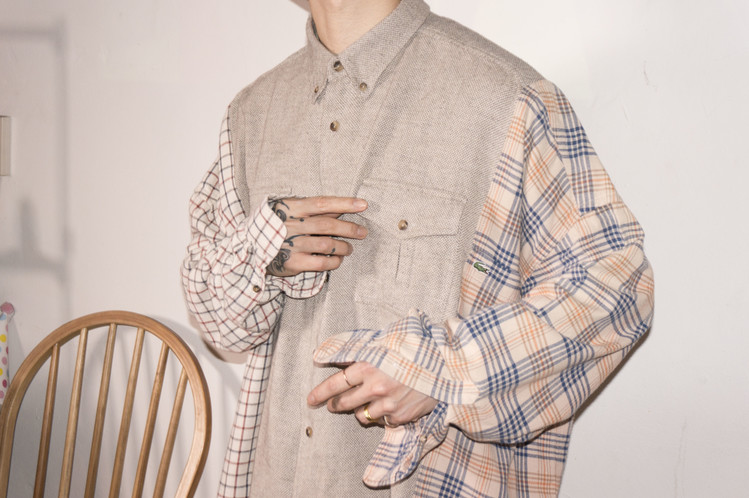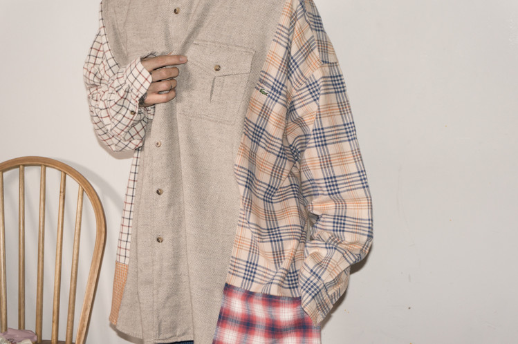 East oklm, The hand remake garments로 베이지 색상 플란넬 셔츠 여러장을 해체하고 재구성하여 만들어진 상품. 왼쪽 가슴 주머니에 라코스테 로고 자수를 볼 수 있으며, 전체적으로 같은 계열의 따뜻한 컬러감의 배치로 좋은 균형감을 가진 옷 입니다.