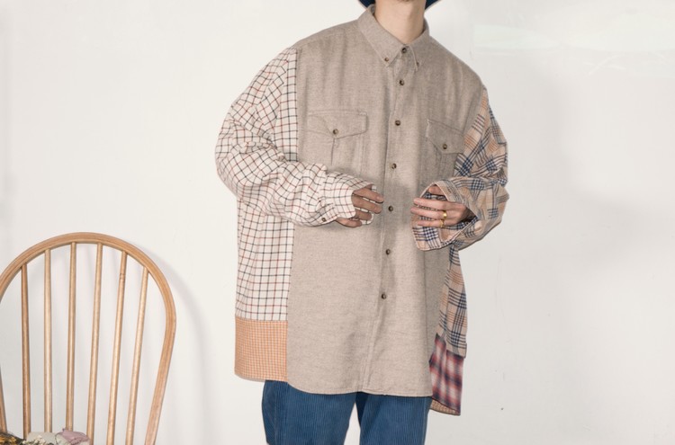 East oklm, The hand remake garments, mixed flannel shirt (Lacoste, Beige)