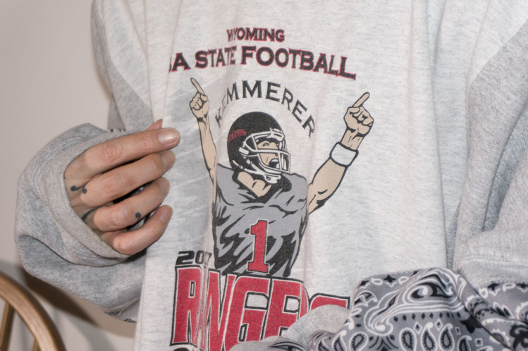 East oklm, The hand remake garments로 레트로한 Football 프린트가 인상적인 멜란지 색상의 스웻셔츠와 그레이 색상의 스웻셔츠를 재조합하고, 반다나로 포인트를 만든 상품. 두 스웻셔츠는 적당감의 톤차이를 두었고, 양쪽 소매는 빈티지 반다나로 그레이 색상과 화이트 색상으로 만들어 졌습니다.