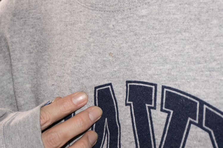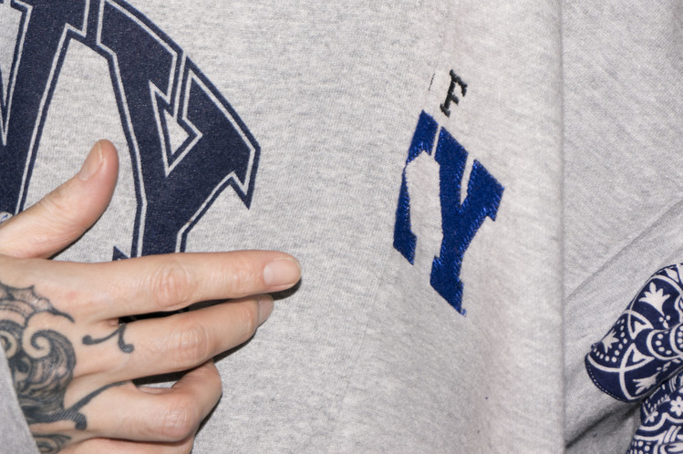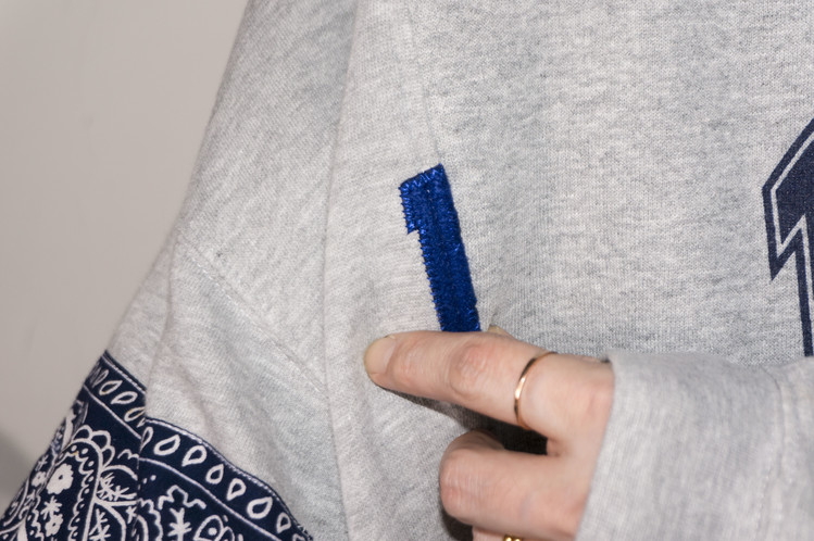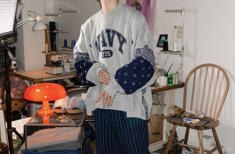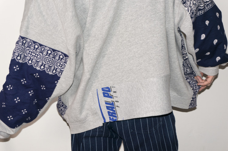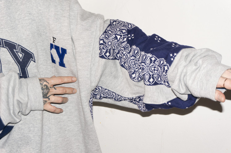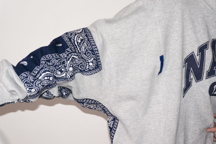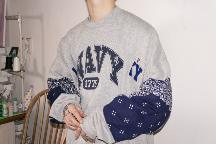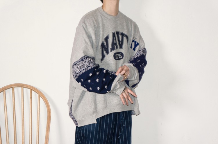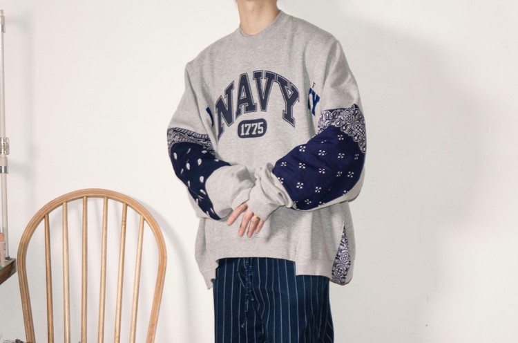 East oklm, The hand remake garments로 레트로한 US Navy 프린트가 있는 스웻셔츠와 그레이 색상의 스웻셔츠를 믹스하고, 반다나로 포인트를 만든 상품. 중앙에 위치한 네이비 색상의 NAVY 프린트와 조각난 자수의 재조합을 볼 수 있으며, 보다 여유로운 실루엣으로 완성되어 편안하게 입을 수 있는 옷 입니다.