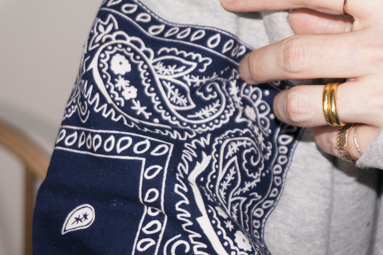 기모가 있는 스웻으로 따뜻함을 품고 있으며, Fast color의 빈티지 네이비 색상의 반다나들은 서로 다른 문양과 색상톤을 지니고 있어 그 차이를 즐길 수 있고, 뒤판의 중심 아래 연결 지어진 다른 조각의 프린트 부분은 길이감을 더해주는 역할과 동시에 좋은 포인트로 자리하고 있습니다.
