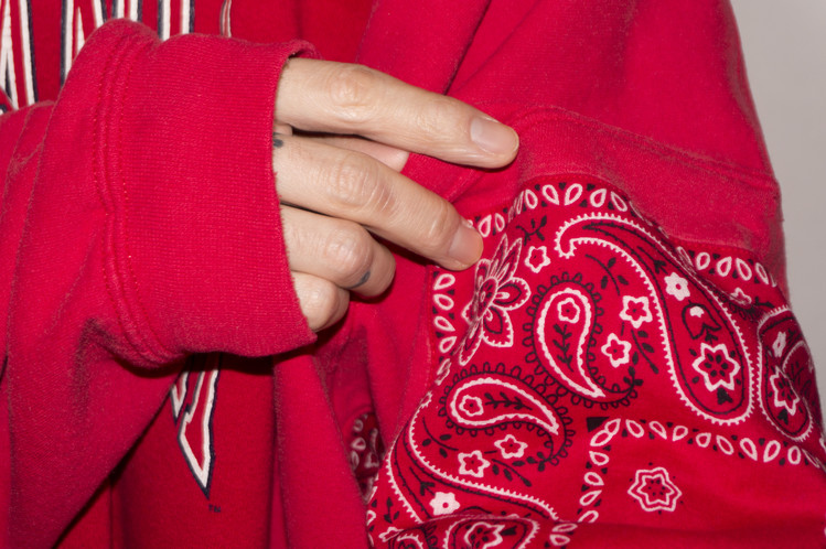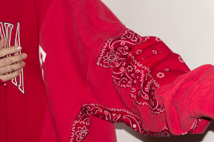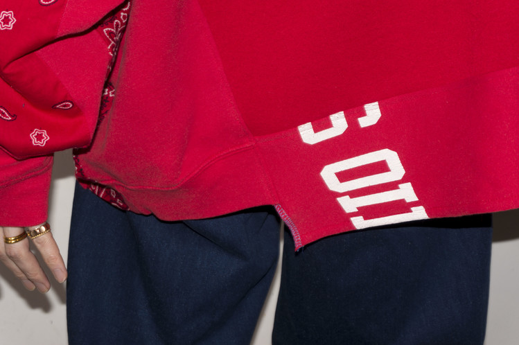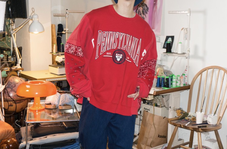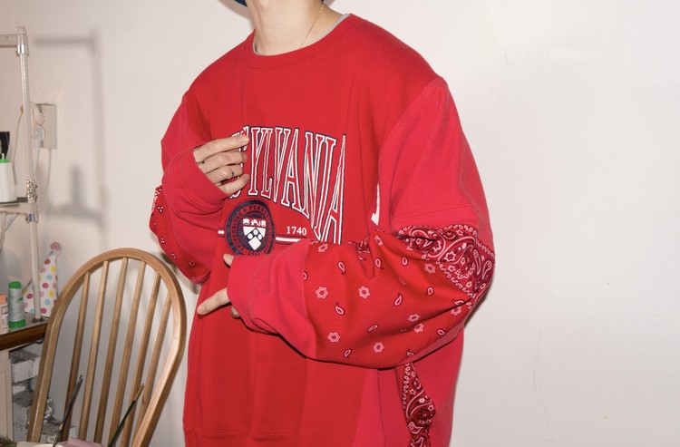 East oklm, The hand remake garments로 레드 색상의 아메리칸 빈티지 스웻셔츠들로 재구성 되고, 반다나로 포인트를 만든 상품. 레트로한 레터링과 프린트가 인상적이며, 양옆은 프린트의 조각들로 연결되어 리메이크 가먼츠의 느낌을 잘 표현하고 있습니다.