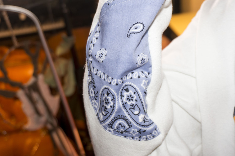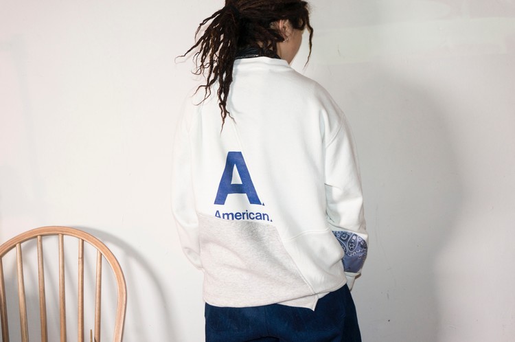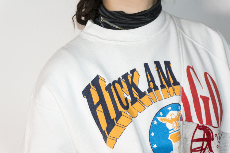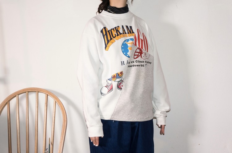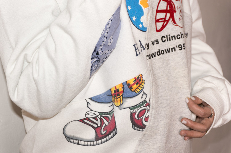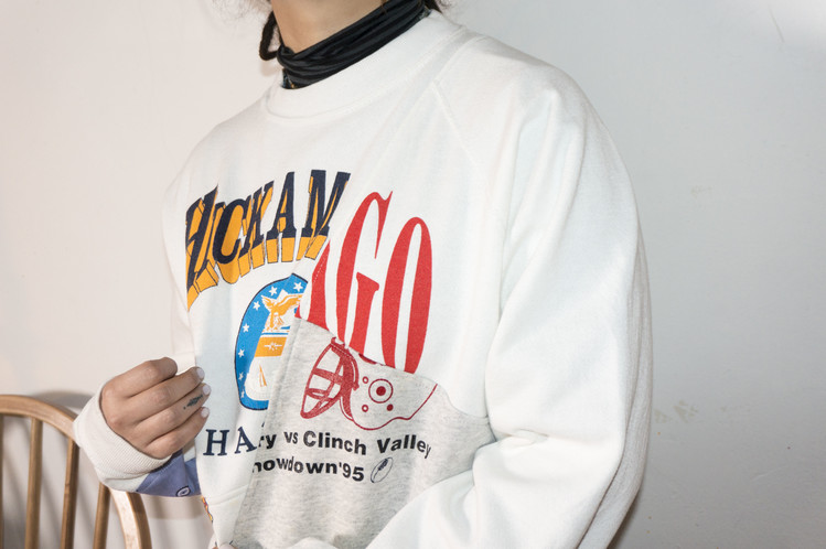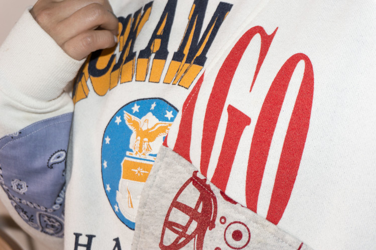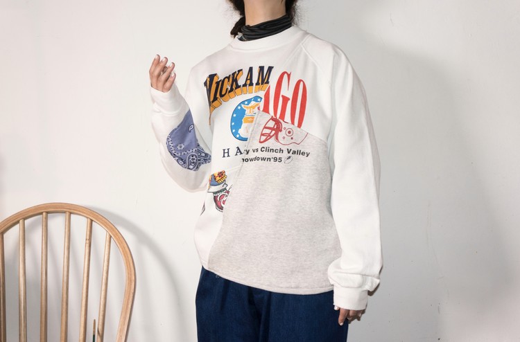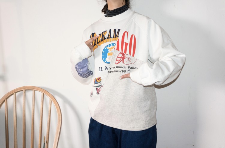 East oklm, The hand remake garments로 여러장의 스웻셔츠들을 해체하고 다시 재구성하여 만들어진 믹스 스웻셔츠 상품. 레트로한 조각난 프린트들의 연결과 소매에 둥근 모양으로 패치워크 되어진 빈티지 반다나의 조합으로, 전체적으로 리메이크 제품의 기분을 더 느낄 수 있습니다.
