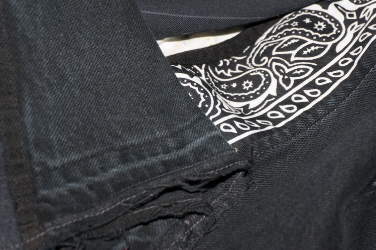 East oklm, The hand remake denim 으로 Levis 512. Black 데님 팬츠에 테일러 원단의 패치워크와 안심을 늘린 부분, 반다나 포인트를 확인할 수 있는 리메이크 상품. 불규칙하지만 정돈된 느낌의 패치워크는 같은 톤의 블랙색상과 진한 네이비 색상의 테일러 원단을 이용하여 표현 되었고, 그레이 색상의 실로 직선의 스티치와 작은 지그재그 스티치를 볼 수 있습니다.