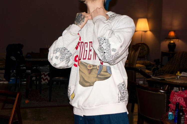 East oklm, The hand remake garments로 여러장의 아메리칸 빈티지 스웻셔츠들과 Fast color의 화이트 반다나, 그리고 페이즐리 원단으로 만들어진 얇은 로프를 이용하여 완성된 상품.