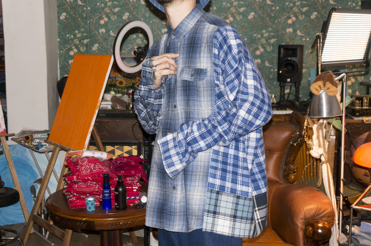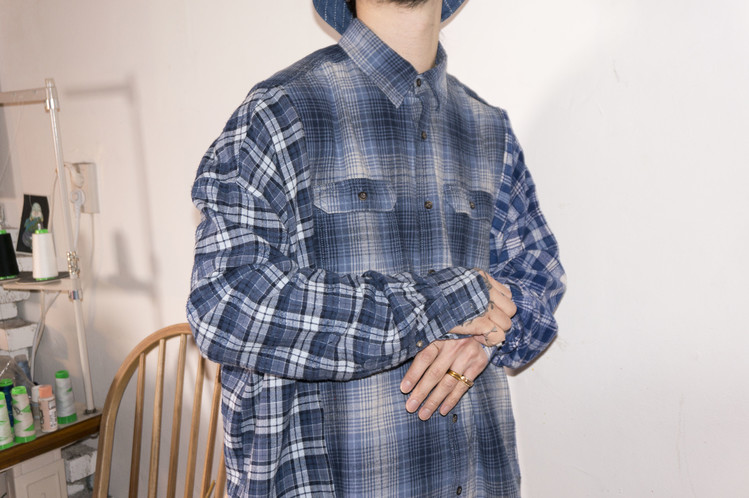 East oklm, The hand remake garments로 여러장의 블루 색상 플란넬 셔츠들을 해체하고 재구성하여 만들어진 상품. 전체적으로 블루 톤의 레트로한 체크 패턴이 인상적인 셔츠들을 조합하였습니다.