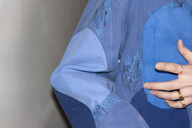 East oklm, The hand remake garments로 짜임이 좋은 빈티지한 블루 색상의 프렌치 워크웨어에 다른 프렌치 워크웨어의 조각들로 패치워크 되어지고, 반다나로 옆을 채워 만들어진 상품. 불규칙한 둥근 모양의 프렌치 워크웨어 조각들로 안쪽과 바깥쪽을 번갈아가며 패치워크 되어졌으며, 지그재그 스티치를 이용하여 끝부분을 잡아주어 보다 단단하게 만들어짐과 동시에 보다 빈티지한 느낌을 의도하여 표현 되었습니다.