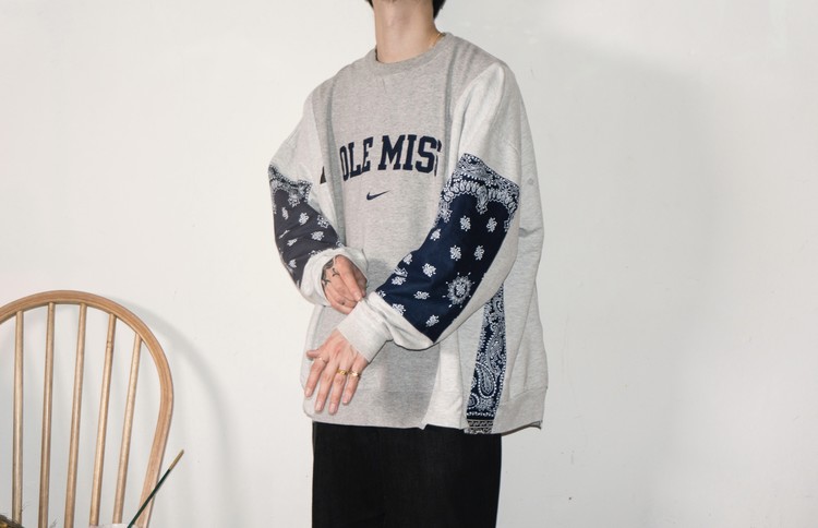East oklm, The hand remake garments로 그레이 색상의 NIKE 스웻셔츠와 U.S ARMY 스웻셔츠를 재조합하고, 반다나로 포인트를 만든 상품. 약간의 색상의 톤차이를 이용하여 믹스 되었으며, NIKE 스웻셔츠를 중심으로 양쪽으로 U.S ARMY 스웻셔츠를 활용하였습니다.