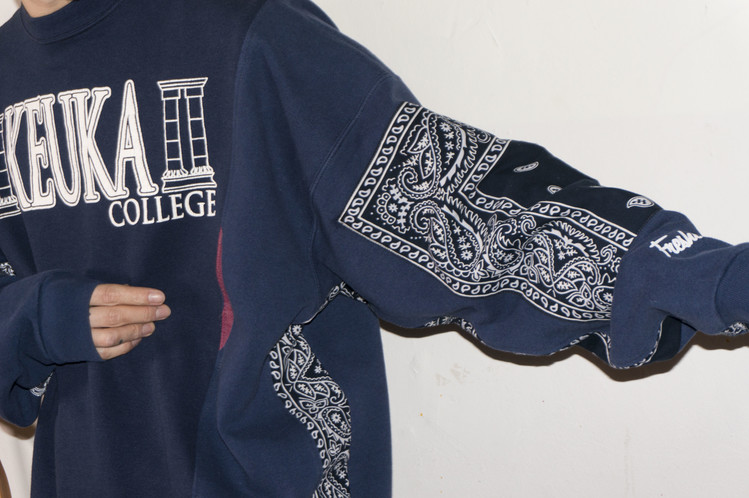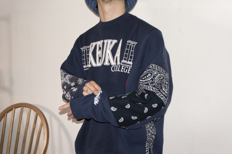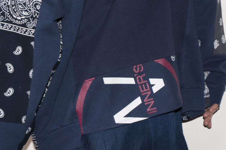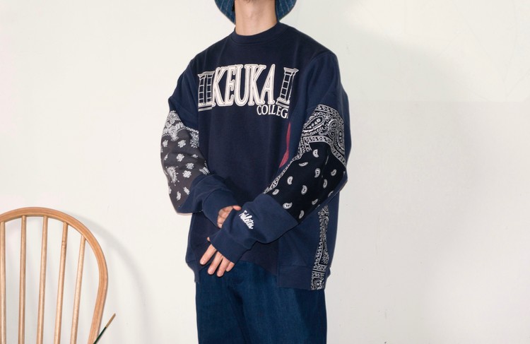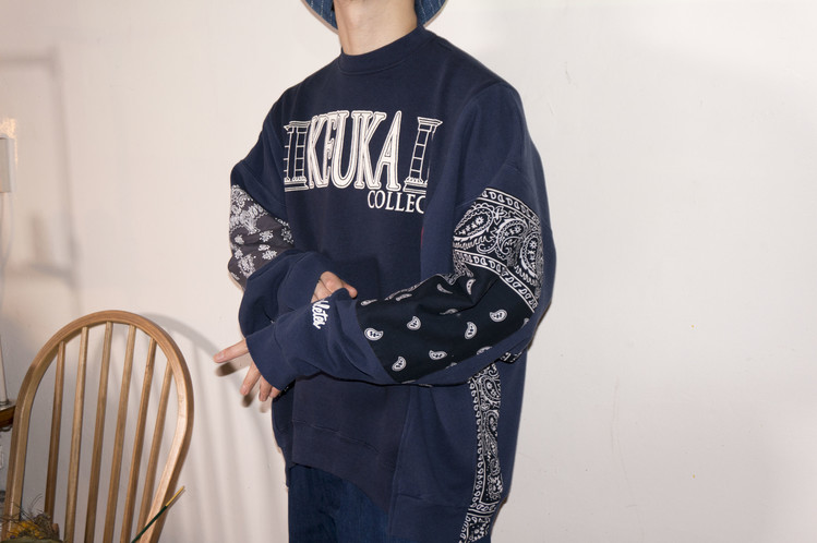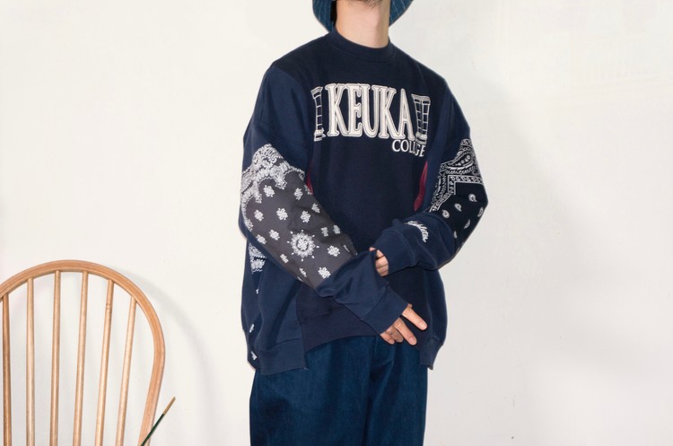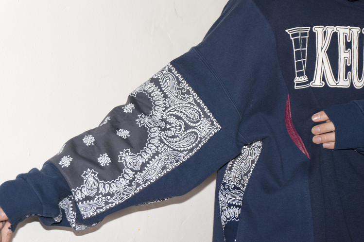 East oklm, The hand remake garments로 네이비 색상의 아메리칸 빈티지 스웻셔츠들과 반다나를 이용하여 포인트를 만든 상품. 두껍지 않은 스웻셔츠들의 재조합으로 보다 여유로운 실루엣으로 완성 되었으며, 양쪽 소매에 넓게 패치워크 되어지고, 옆을 채운 반다나는 진한 네이비 색상과 탈색한 반다나를 이용하여 만들어 졌습니다.