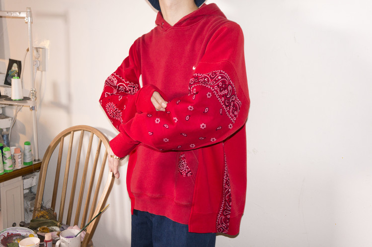 East oklm, The hand remake garments로 레드 색상의 Nike 후디를 중심으로 아메리칸 빈티지 스웻셔츠를 해체하고 재구성하여 연결하고, 반다나로 포인트를 만든 상품. 같은 레드 색상의 스웻셔츠로 프린팅의 조각이 보이도록 연결하고 뒤판의 길이감을 보다 길게 하여 좋은 균형감으로 완성 되었습니다.