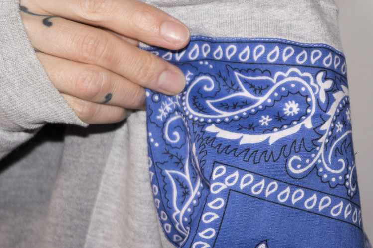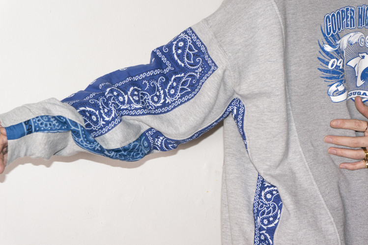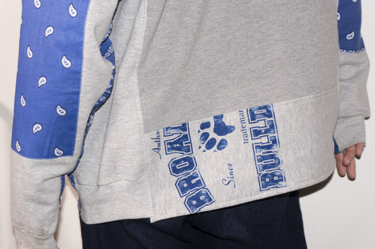 East oklm, The hand remake garments로 그레이 색상에 블루 색상의 프린팅이 있는 스웻셔츠들을 연결하여 반다나로 포인트를 만든 상품. 같은 그레이 색상이나 약간의 톤차이가 있는 스웻셔츠들로 재구성 되었으며, 양쪽 소매에 넓게 패치워크 되고 옆을 채운 블루 색상의 반다나들은 앞판과 뒤판의 프린팅들과 같은 블루 색상의 톤을 볼 수 있습니다.