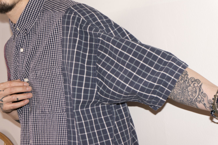 색상의 톤이 어두운 셔츠들을 양쪽에 배치하여 균형적인 색감의 형태를 가지며, 양옆 아래도 조화로운 색상의 체크 패턴 셔츠 조각들을 연결 하였습니다. 보다 여유로운 실루엣이나 정사이즈에 가까우며, 편안하고 시원하게 입을 수 있는 하나의 옷으로 완성 되었습니다.