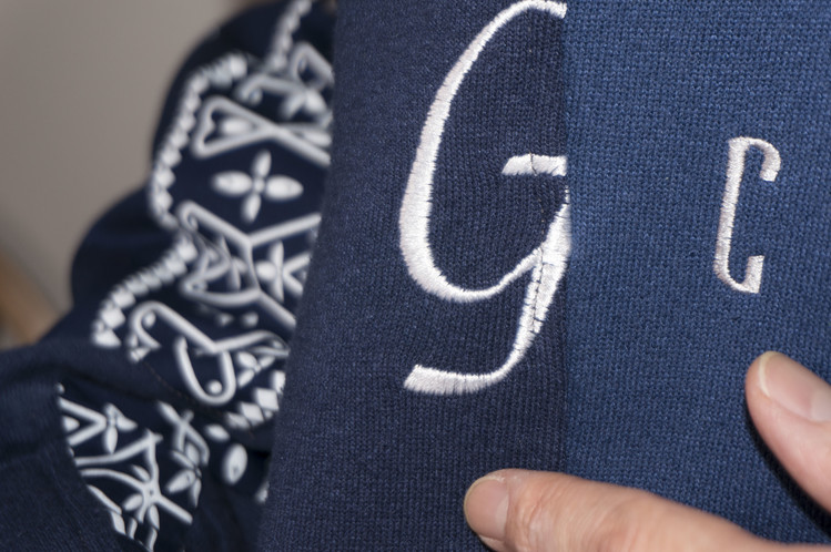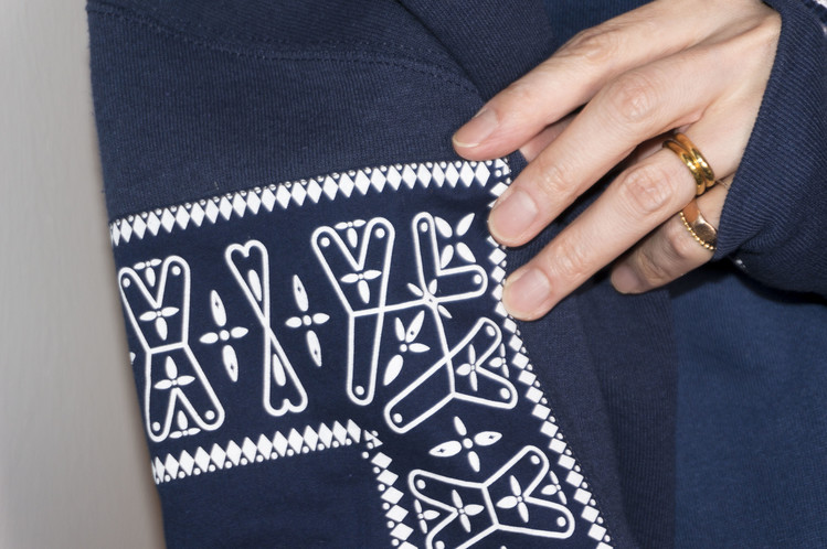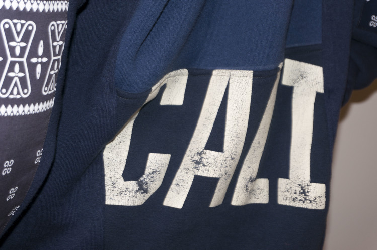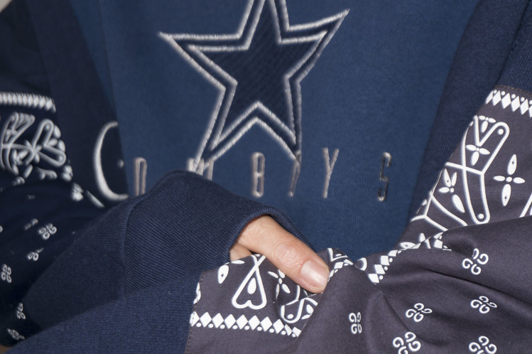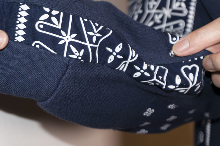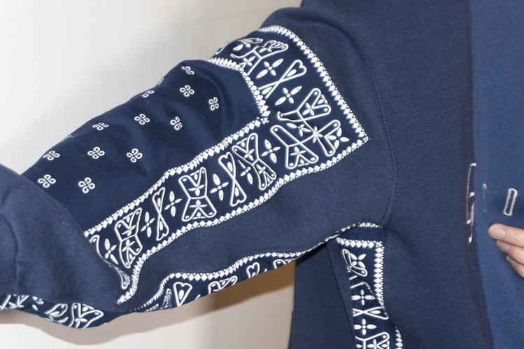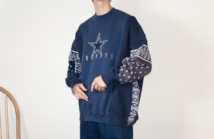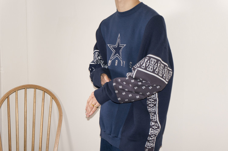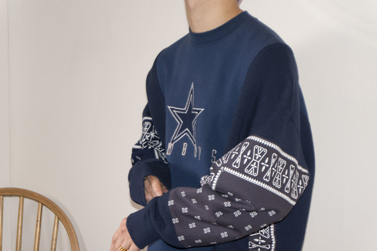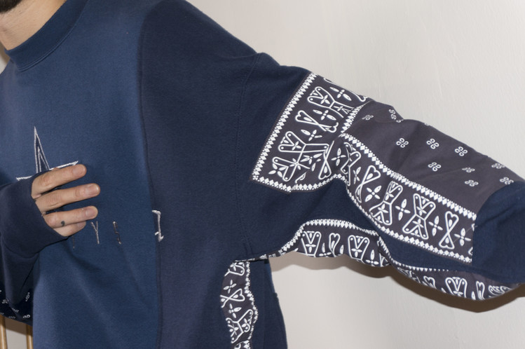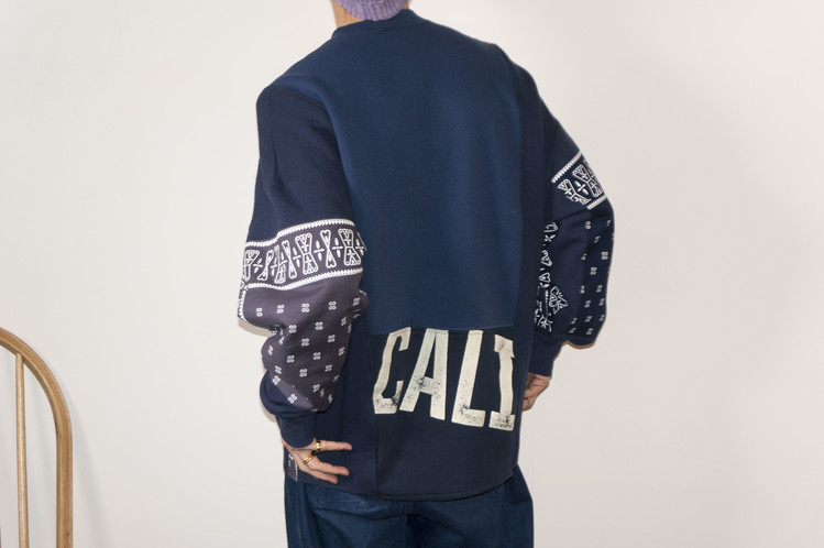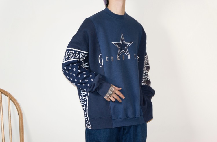East oklm, The hand remake garments로 네이비 색상의 아메리칸 빈티지 스웻셔츠들과 반다나를 이용하여 만들어진 스웻셔츠 상품. 레트로한 자수와 프린팅의 조각의 연결을 볼 수 있으며, ‘East oklm, indigo blue bomb’ 반다나를 양쪽 소매에 넓게 패치워크하고 옆을 채워 움직임과 함께 보여질 좋은 포인트를 확인할 수 있습니다.