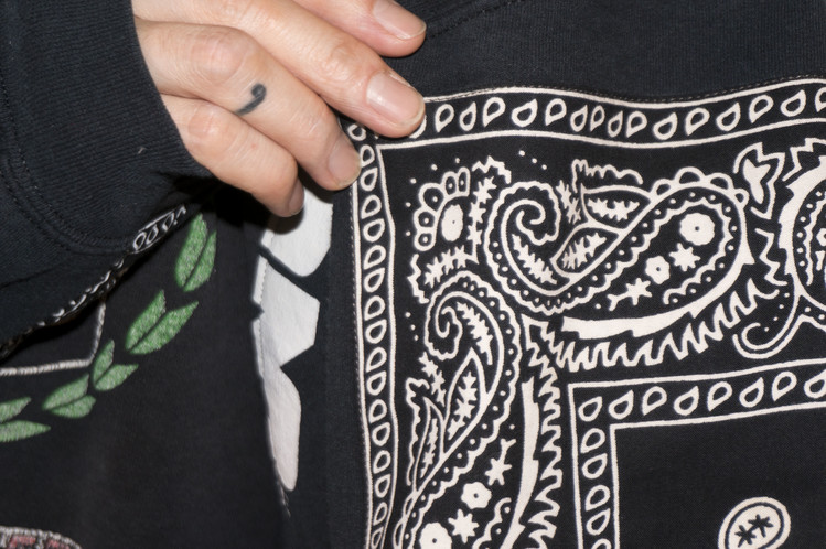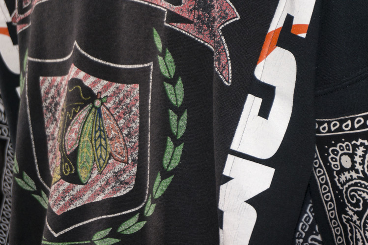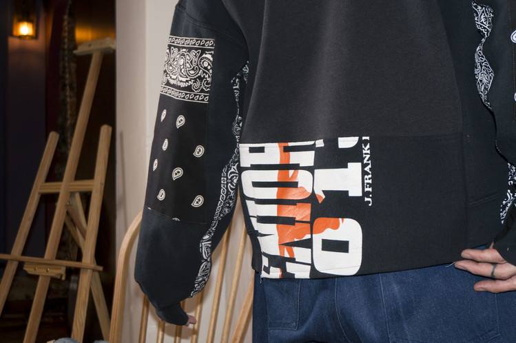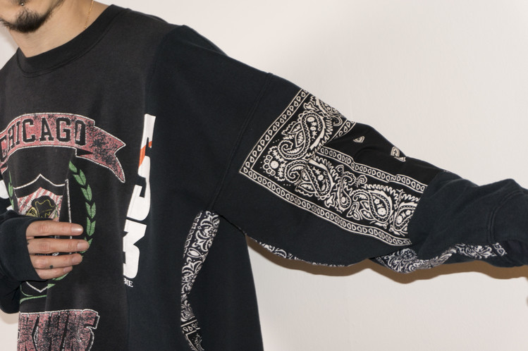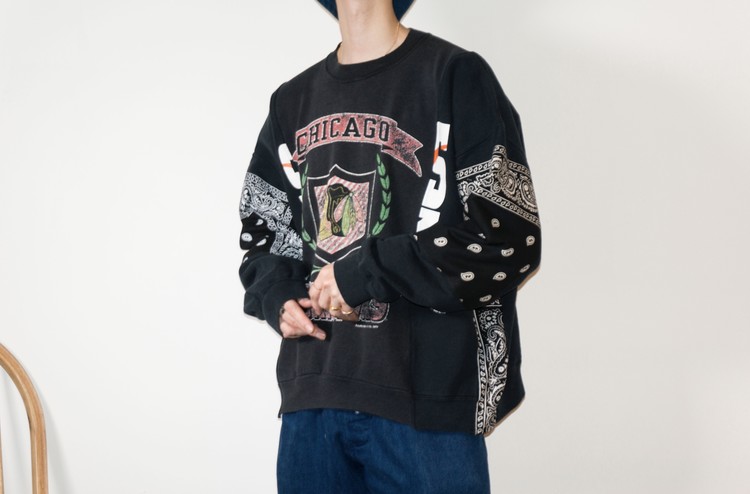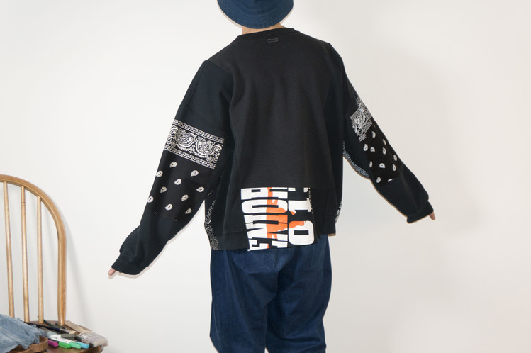 East oklm, The hand remake garments로 아메리칸 빈티지 스웻셔츠들을 해체하고 재구성하여 반다나로 포인트를 만든 상품. 레트로한 세월감의 프린팅을 볼 수 있는 브랙 스웻셔츠들의 조합을 볼 수 있으며, 양옆의 프린팅 조각과 뒤판의 길이감을 더한 좋은 균형감을 볼 수 있습니다.
