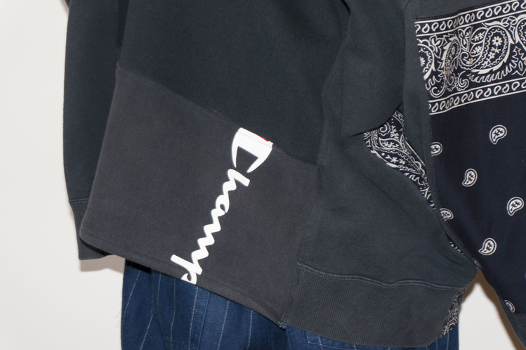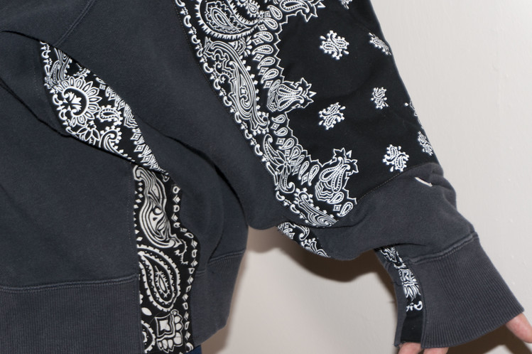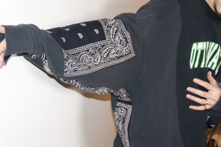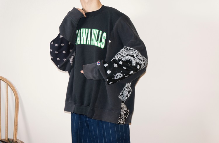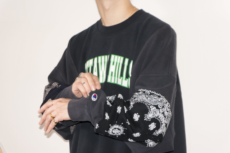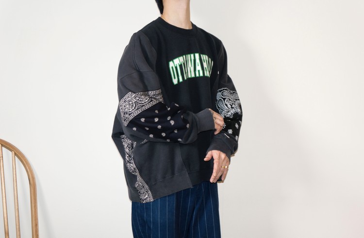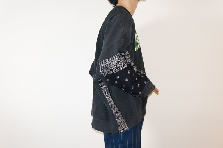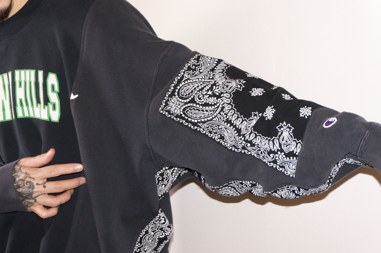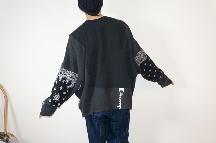East oklm, The hand remake garments로 블랙 색상의 아메리칸 빈티지 스웻셔츠와 챔피온 스웻셔츠를 해체하고 재구성하여 반다나로 포인트를 만든 상품. 같은 블랙 색상이나 색상의 톤차이를 확인할 수 있으며, 챔피온의 로고 프린팅 조각으로 뒤판을 연결하여 길이감을 더해 보다 좋은 균형감으로 완성 되었습니다.