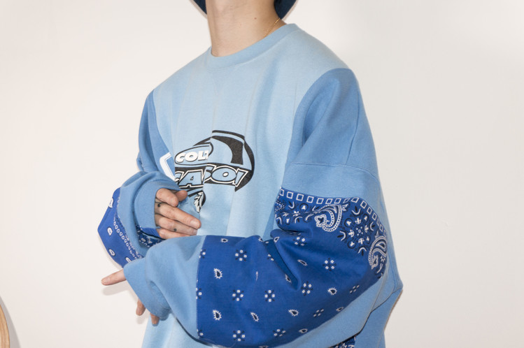 East oklm, The hand remake garments로 스카이 블루 색상의 아메리칸 빈티지 스웻셔츠들을 해체하고 재구성하여 반다나로 포인트를 만든 상품. 같은 스카이 블루 색상이나 톤의 차이가 있는 스웻셔츠들을 믹스하였으며, 블루 색상의 반다나를 양쪽 소매에 넓게 패치워크 하였습니다.