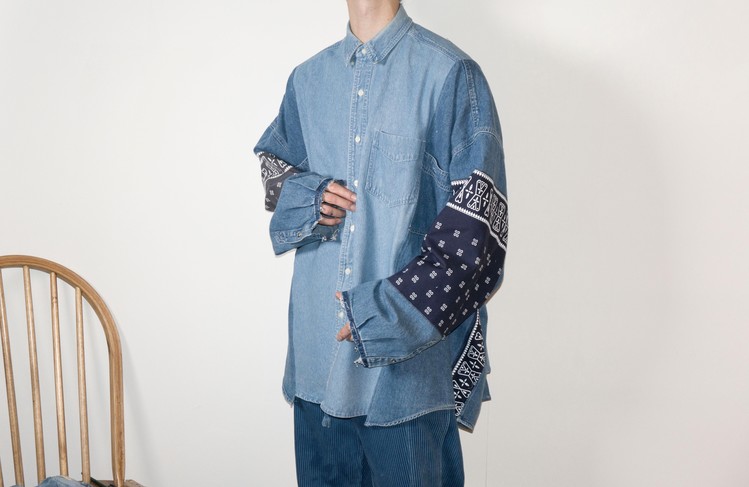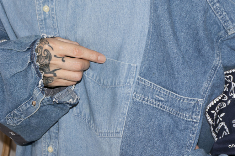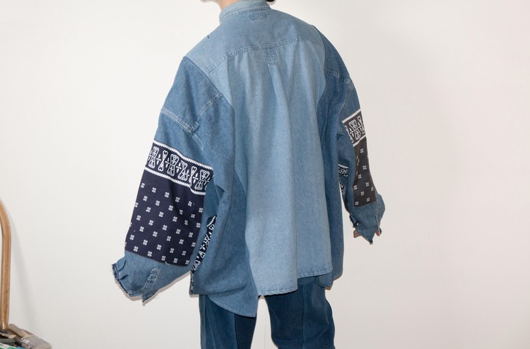 East oklm, The hand remake garments로 데님 셔츠들을 해체, 재구성하여 Landfill 형태의 작업으로 마무리된 상품.
