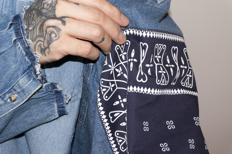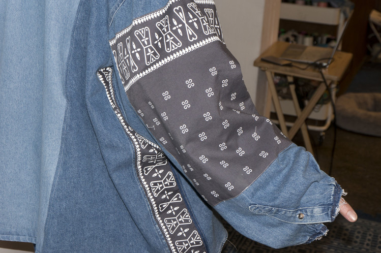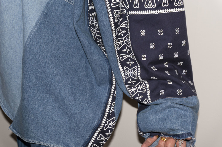 East oklm, indigo blue bomb 반다나들을 탈색하여 완성된 오묘한 색상의 반다나들을 양쪽 소매에 넓게 패치워크하고, 옆을 채워 좋은 포인트를 볼 수 있습니다. 서로 다른 탈색의 정도가 인상적 입니다.
