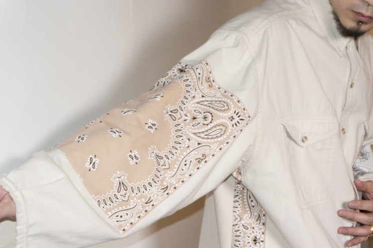 East oklm, The hand remake garments로 네츄럴한 Ecru 색상의 셔츠에 반다나로 포인트를 만든 Landfill 셔츠 상품. 전체적으로 깔끔한 느낌을 살려 베이지 색상의 반다나와 화이트 색상의 반다나를 사용하였습니다.