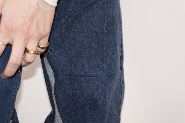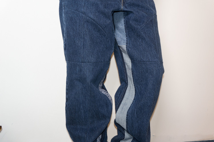 East oklm, The hand remake denim으로 단단한 중청의 Levis 550에 곡선과 직선의 라인을 만들고, 안심을 다른 데님의 뒷면으로 채워 반다나로 포인트를 만든 상품. 팬츠의 앞판에 가로,세로의 중심선에 라인을 만들고, 가로 중심선의 위쪽을 곡선으로 표현한 모양을 볼 수 있습니다. 이는 조각이 나 있는 것과 같은 효과를 주며, 은은하게 드러나는 디테일 입니다.