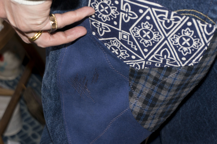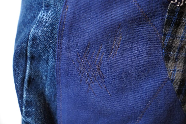 팬츠의 뒤판에는 아래의 중심으로 부터 곡선으로 표현된 라인을 볼 수 있고, 뒷주머니의 반다나와 프렌치 워크웨어, 플란넬 셔츠 조각의 패치워크로 보다 좋은 포인트들을 확인할 수 있습니다. 안심을 채운 데님의 뒷면으로 보다 여유로운 실루엣을 가지며, 움직임과 함께 보여질 반다나 또한 확인할 수 있는 완성도 높은 하나의 옷 입니다.