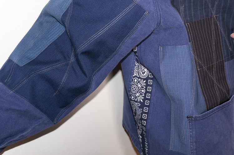 East oklm, The hand remake garments로 빈티지한 인디고 색상의 프렌치 워크웨어에 테일러 원단으로 패치워크하고 반다나로 옆을 채워 만들어진 자켓 상품. 매력적인 빈티지한 인디고 색상과 어울리는 블랙과 블루 계열의 테일러 원단들로 불규칙하나 안정감있는 패치워크를 볼 수 있고, 왼쪽 소매에 위치한 테일러 원단의 리미지(원단의 혼용률과 출처가 나와 있는 부분)파트 또한 좋은 포인트로 자리 합니다.