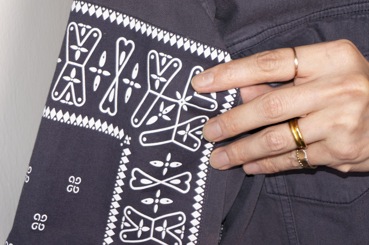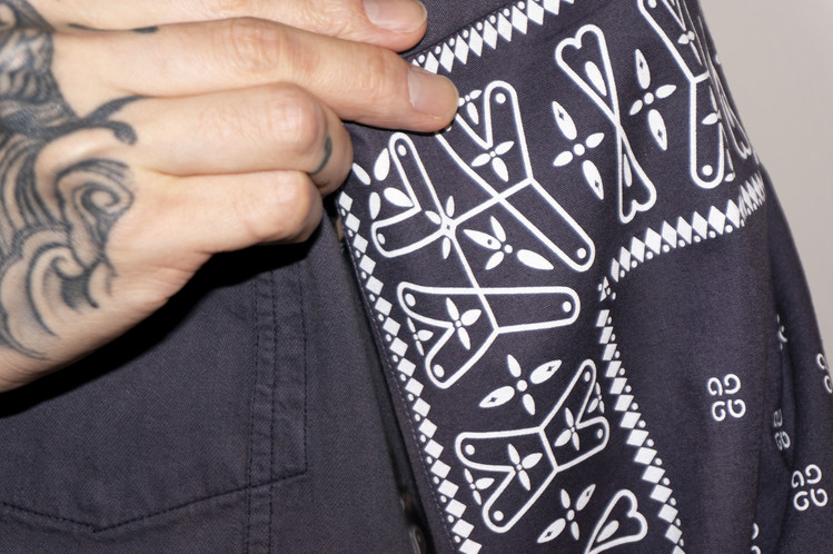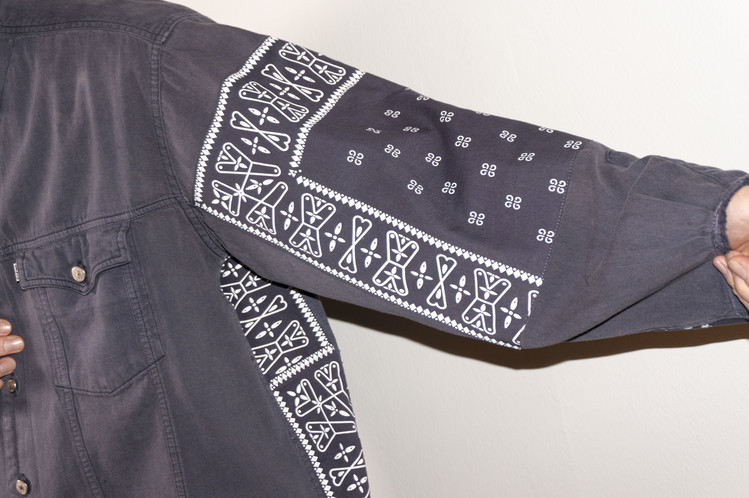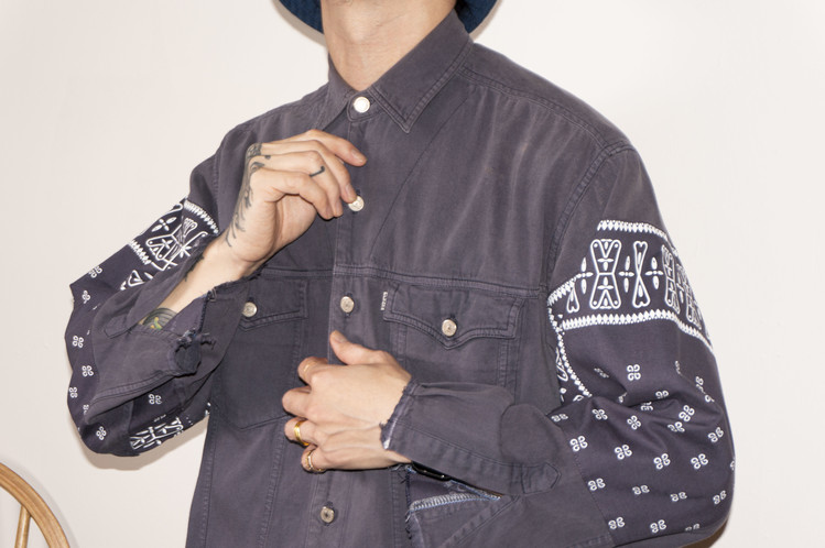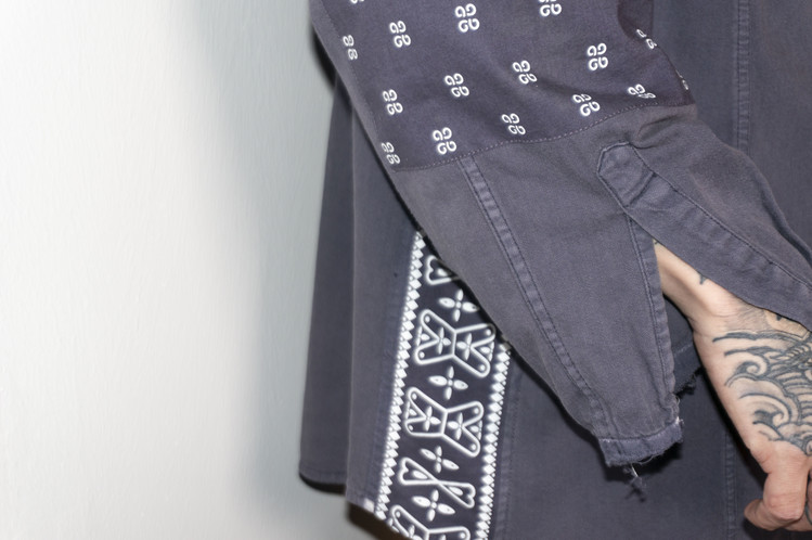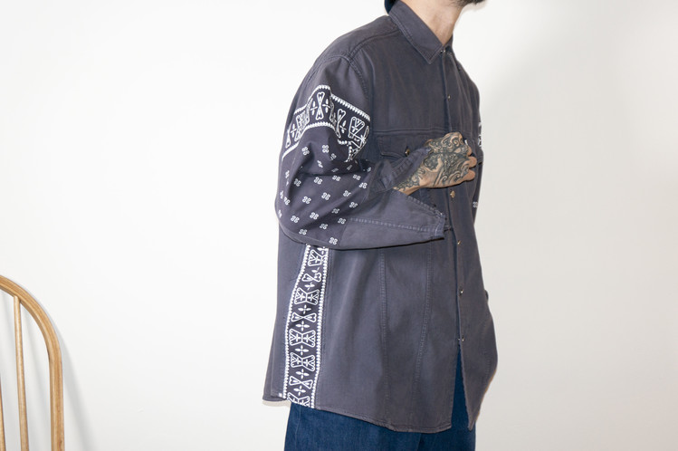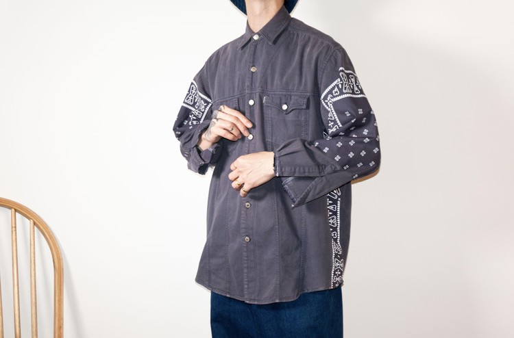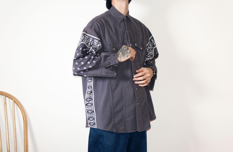 East oklm, The hand remake garments로 오묘한 그레이 색상의 빈티지 리바이스 셔츠를 이용하여 만들어진 Landfill 셔츠 상품. 색상의 톤을 맞추기 위해 탈색작업을 진행한 반다나들을 이용하였으며, 반다나는 서로 같은 문양과 컬러를 양쪽 소매와 옆에 표현하여 안정감있는 옷으로 완성 되었습니다.