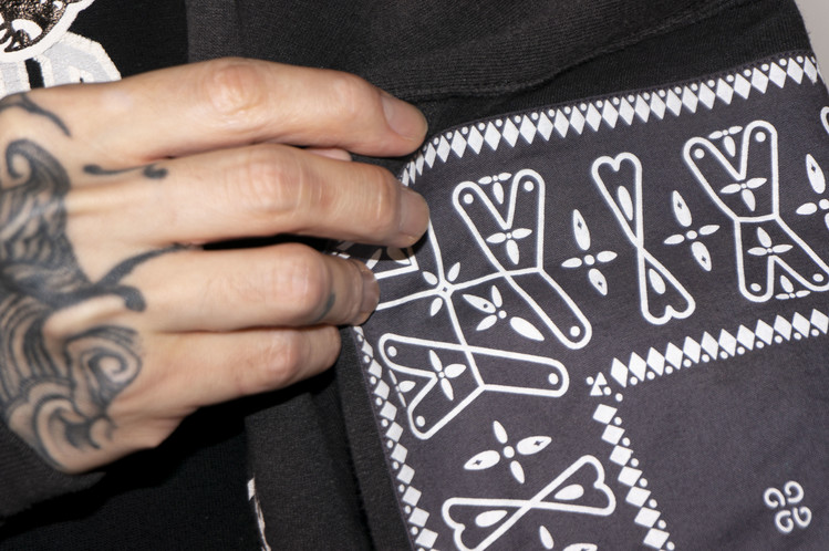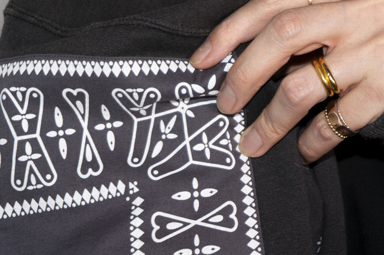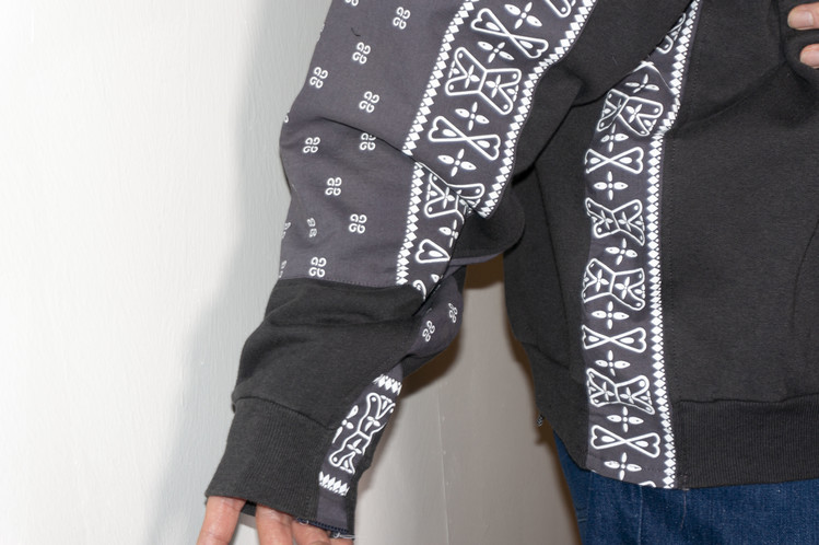양쪽 소매에 넓게 패치워크 되어진 반다나는 짙은 그레이 색상에 맞추어 탈색작업을 진행하여 균형감있게 자리하고, 옆을 채운 반다나는 움직임과 함께 더욱 돋보일 부분 입니다. 뒤판에 연결된 프린팅이 있는 스웻셔츠의 조각은 길이감을 더해주어 보다 안정감있는 하나의 옷으로 완성 되었습니다.