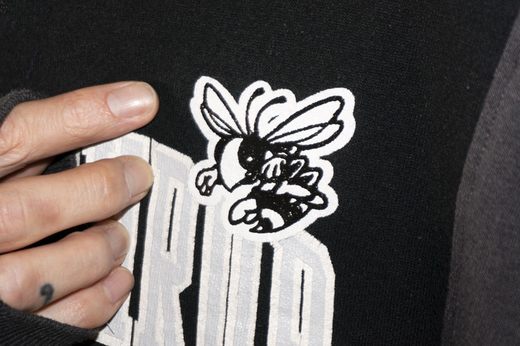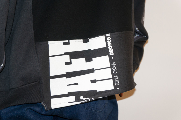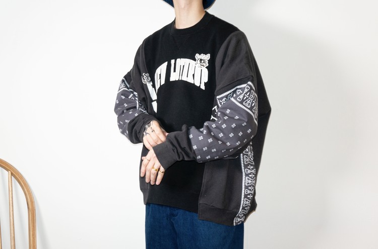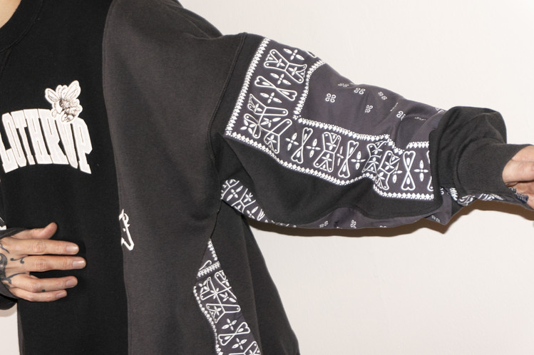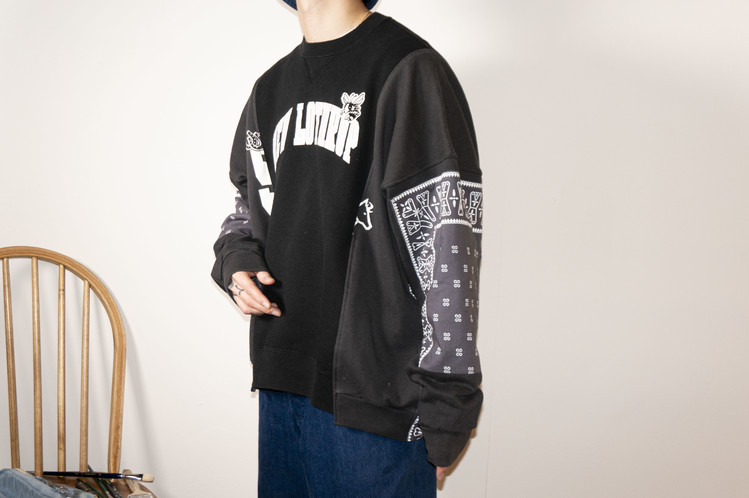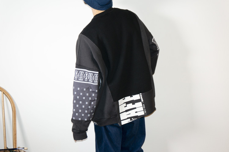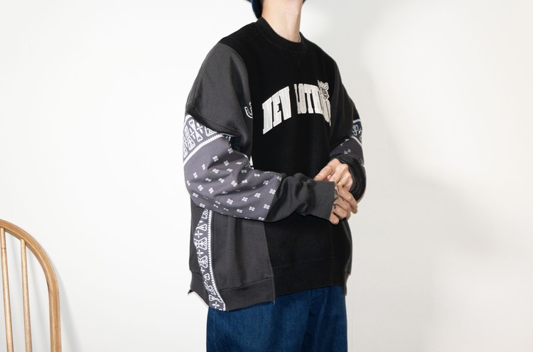 East oklm, The hand remake garments로 블랙컬러와 짙은 빈티지한 그레이 색상의 스웻셔츠를 믹스하고, 반다나로 포인트를 만든 상품. 중심에 레트로한 프린팅이 좋은 포인트를 보이며, 양쪽으로 조각난 프린팅의 연결을 볼 수 있습니다.