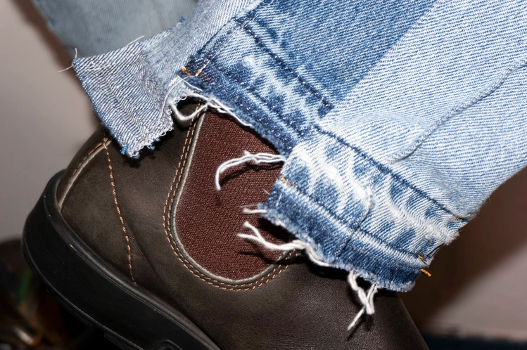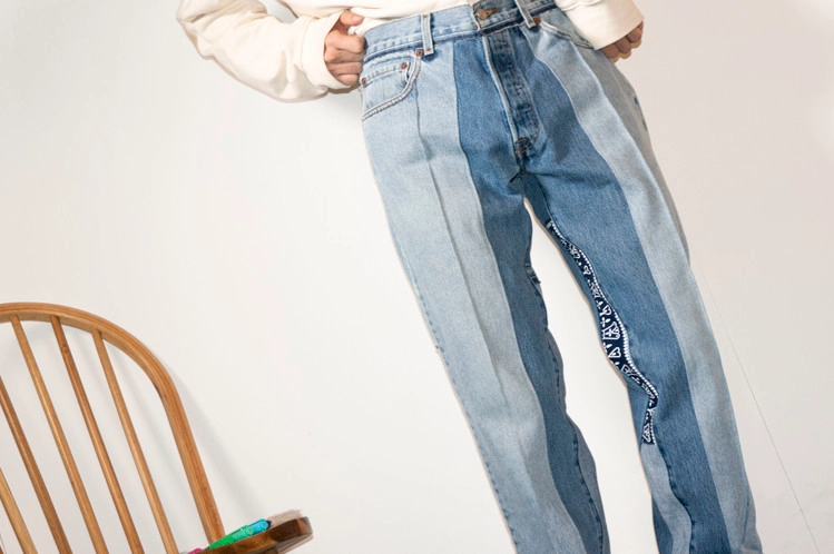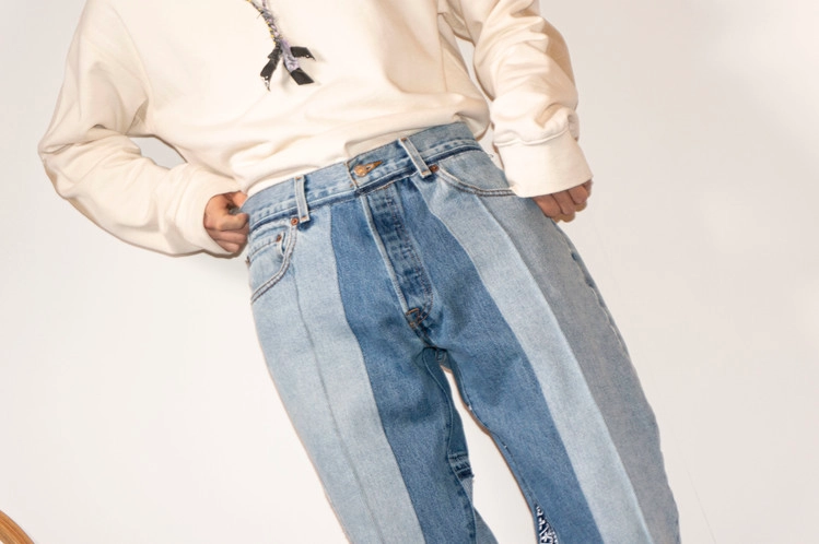 East oklm, The hand remake denim으로 Levis 501, Levis 550 팬츠를 해체하고 재구성하여 얇은 주름으로 라인을 만들고, 팬츠의 안심을 데님의 뒷면 원단으로 채워 완성한 상품. 서로 다른 워싱감의 팬츠를 믹스하여, 색상의 톤에 차이를 두어 보다 선명한 차이를 확인할 수 있습니다.