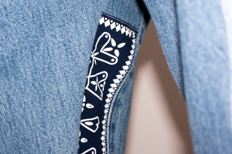 각 팬츠의 실루엣을 살려 전체적으로 편안한 스트레이트 테이퍼드 핏을 볼 수 있으며, 허리 부분은 시접을 밖으로 꺼내어 연결해줌을써 지루하지 않은 포인트를 만들었습니다. 또한 팬츠의 안심을 데님의 뒷면으로 채우고 반다나로 포인트를 만들어 움직임과 함께 보여질 좋은 부분 또한 확인할 수 있습니다.