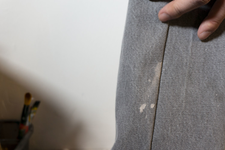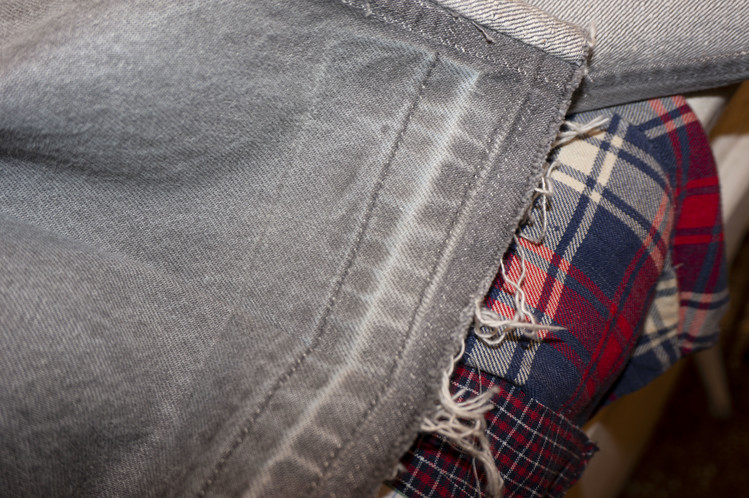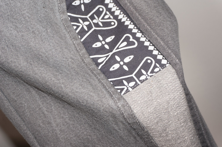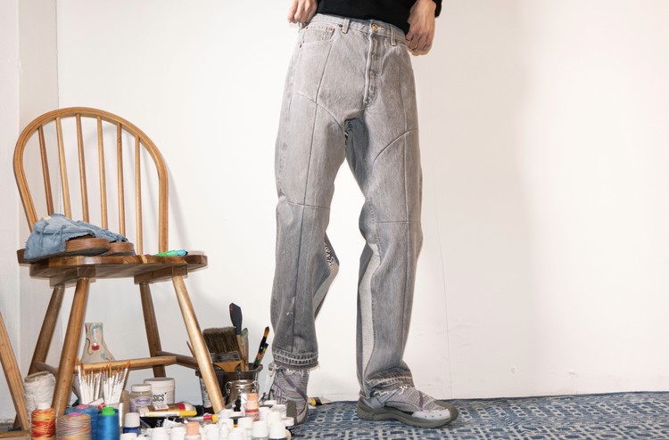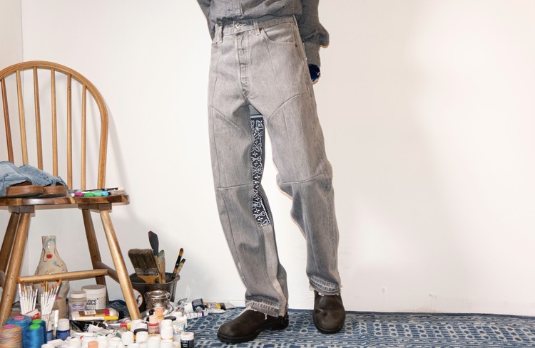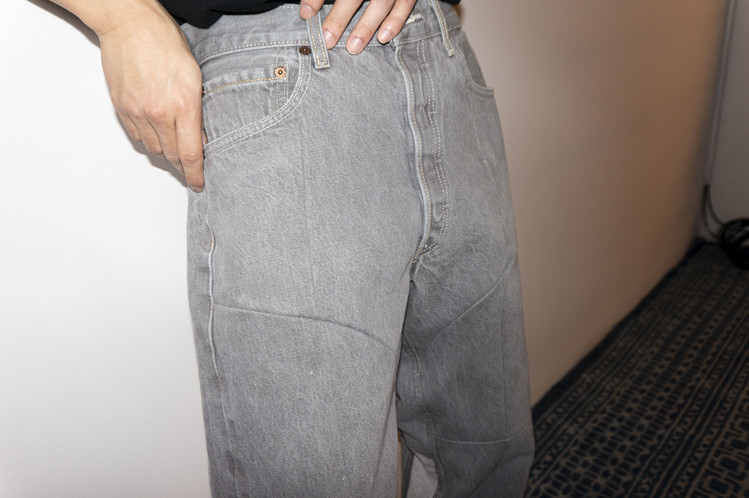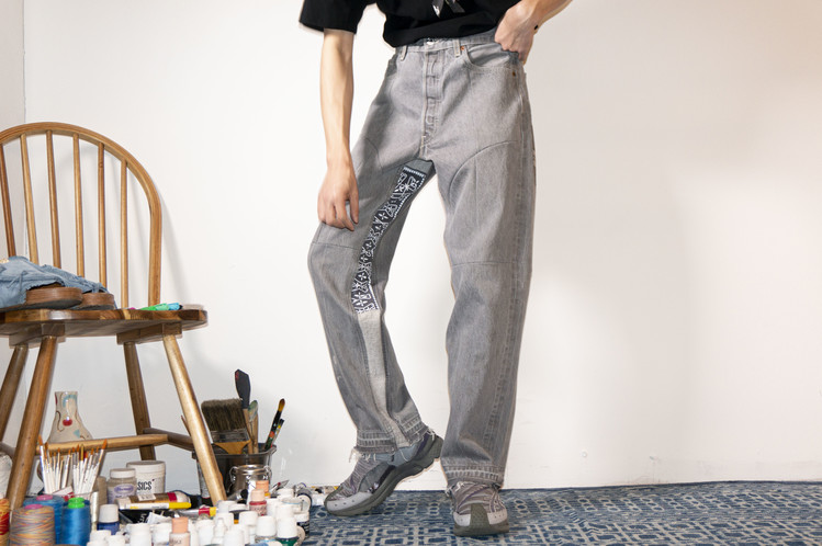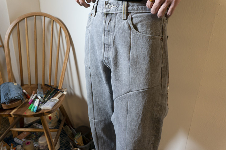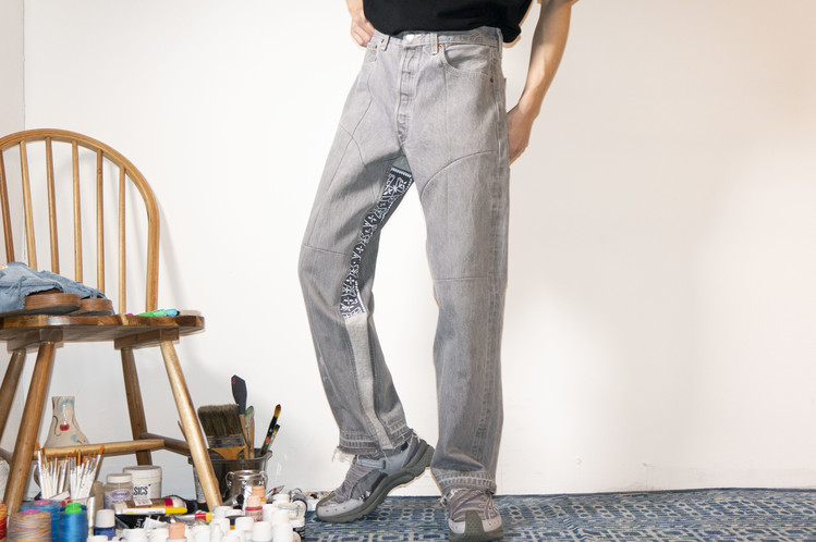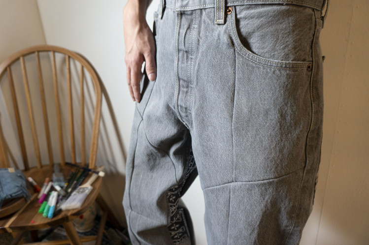 East oklm, The hand remake denim으로 그레이 색상의 Levis 501에 곡선과 직선의 라인을 만들고, 안심을 다른 그레이 데님의 뒷면으로 채워 반다나로 포인트를 만든 상품. 팬츠의 앞판에 가로,세로의 중심선에 라인을 만들고, 가로 중심선의 위쪽을 곡선으로 표현한 모양을 볼 수 있습니다.