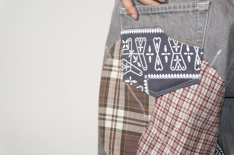 이는 조각이 나 있는 것과 같은 효과를 주며, 은은하게 드러나는 디테일 입니다. 팬츠의 뒤판에는 아래의 중심으로 부터 곡선으로 표현된 라인을 볼 수 있고, 뒷주머니를 탈색한 반다나로 덮고, 조화로운 색감과 체크 패턴을 가진 플란넬 셔츠 조각의 패치워크로 보다 좋은 포인트들을 확인할 수 있습니다.