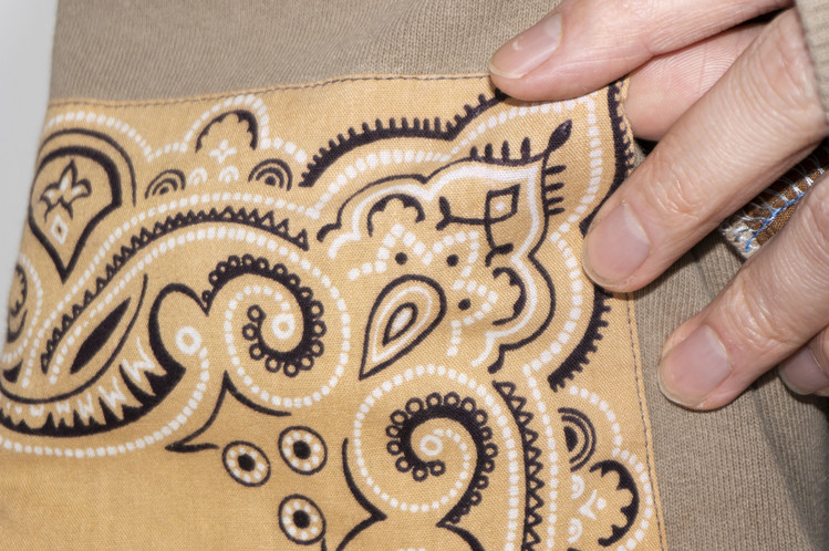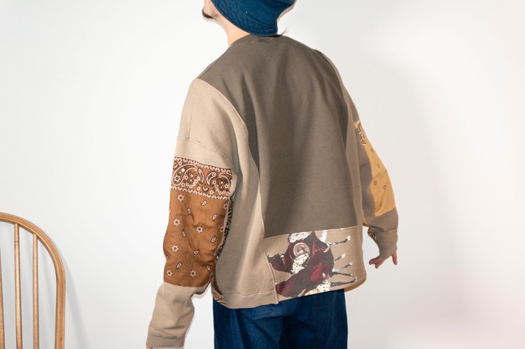 양쪽에 넓게 패치워크 되어진 반다나들은 브라운 계열의 반다나들로 다른 색상과 문양으로 자리하며, 옆을 채워 움직임과 보일 수 있는 좋은 포인트를 확인할 수 있습니다. 뒤판의 길이감을 더한 스웻셔츠의 조각 또한 레트로한 프린팅을 확인할 수 있으며, 좋은 균형감을 만드는 요소로 보입니다.