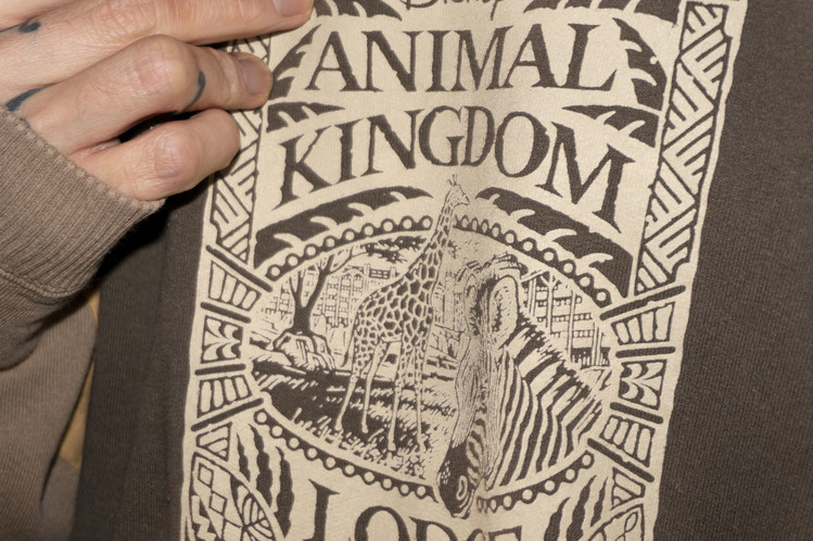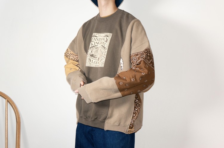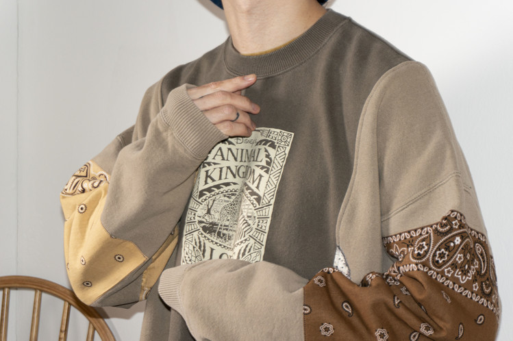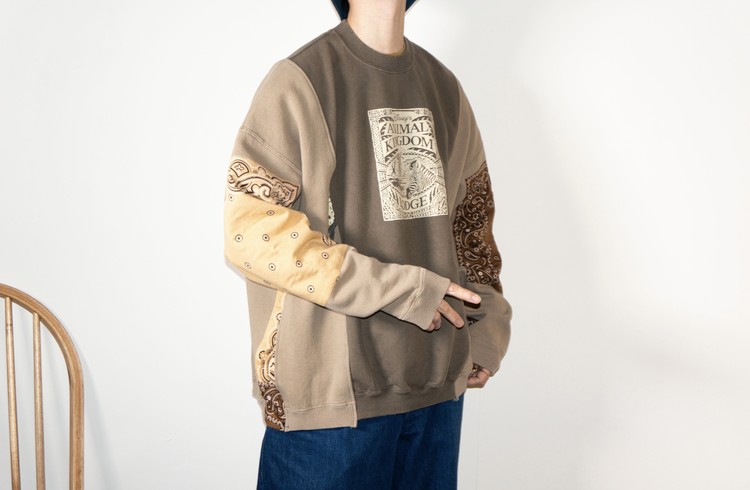 East oklm, The hand remake garments로 카키 빛의 브라운, 베이지 색상의 스웻셔츠들을 해체하고 재구성하여 Fast color의 반다나로 포인트를 만든 상품. 중심에 Disney 스웻셔츠의 귀여운 프린팅을 볼 수 있으며, 같은 카키 색상이나 톤의 차이를 보다 두어 표현 하였습니다.