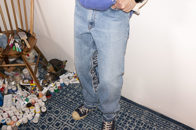 팬츠의 뒤판에는 아래의 중심으로 부터 곡선으로 표현된 라인을 볼 수 있고, 뒷주머니의 탈색한 반다나와 플란넬 셔츠 조각의 패치워크로 보다 좋은 포인트들을 확인할 수 있습니다. 안심을 채운 데님의 뒷면으로 보다 여유로운 실루엣을 가지며, 움직임과 함께 보여질 반다나 또한 확인할 수 있는 완성도 높은 하나의 옷 입니다.