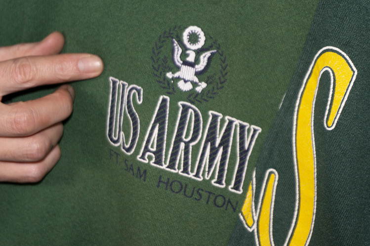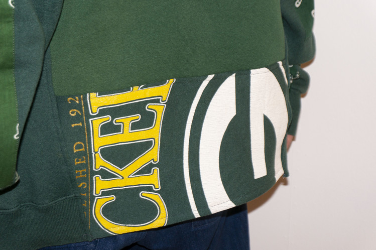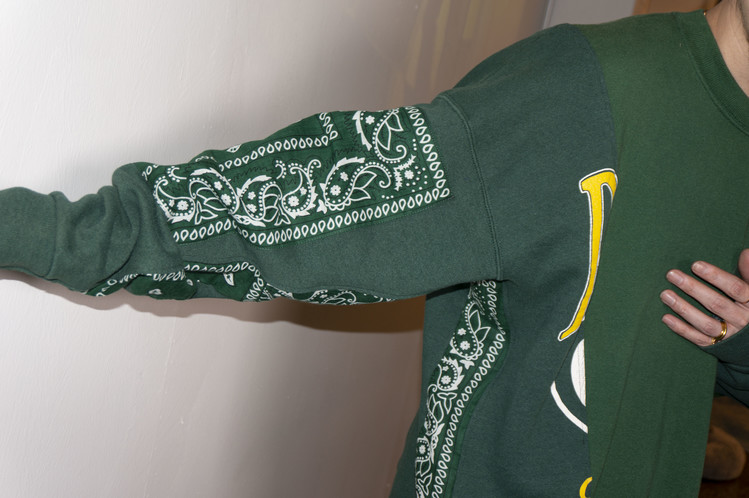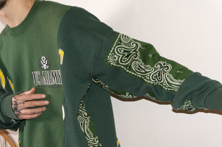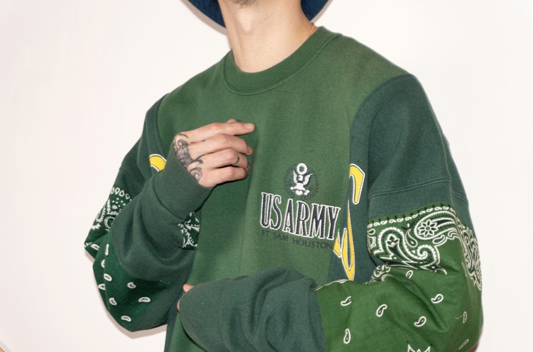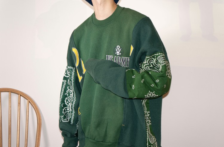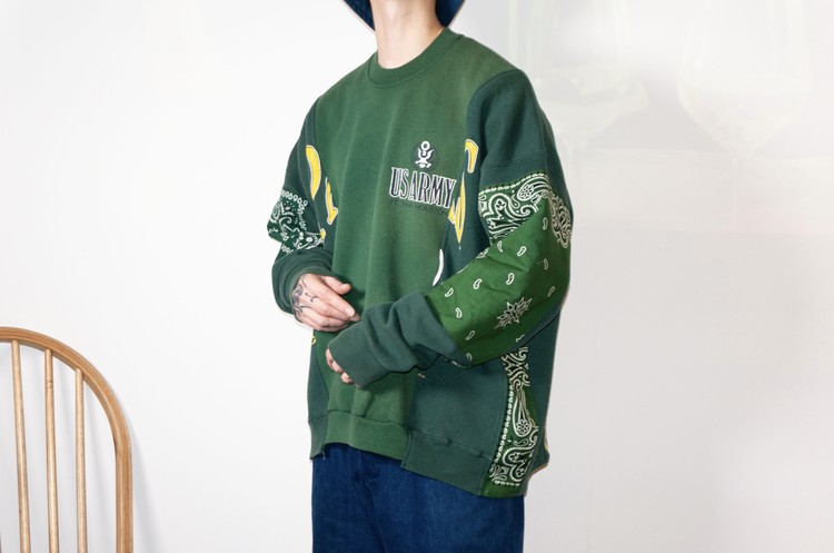 East oklm, The hand remake garments로 U.S.Army 스웻셔츠와 아메리칸 빈티지 스웻셔츠들을 해체하고 재구성하여 반다나로 포인트를 만든 상품. 그린 색상의 스웻셔츠들을 이용하여 빈티지한 색감과 톤의 차이를 확인할 수 있으며, 레트로한 프린팅의 조각들이 연결된 모양을 볼 수 있습니다.