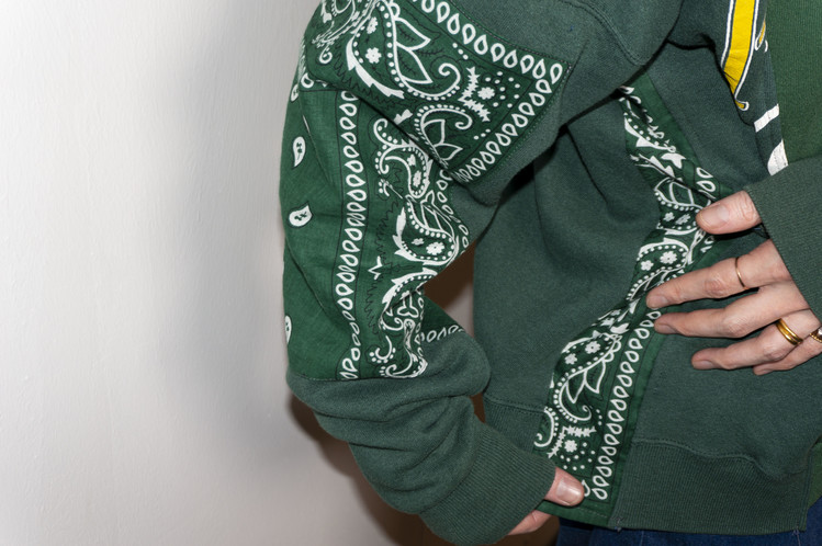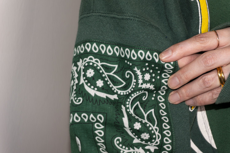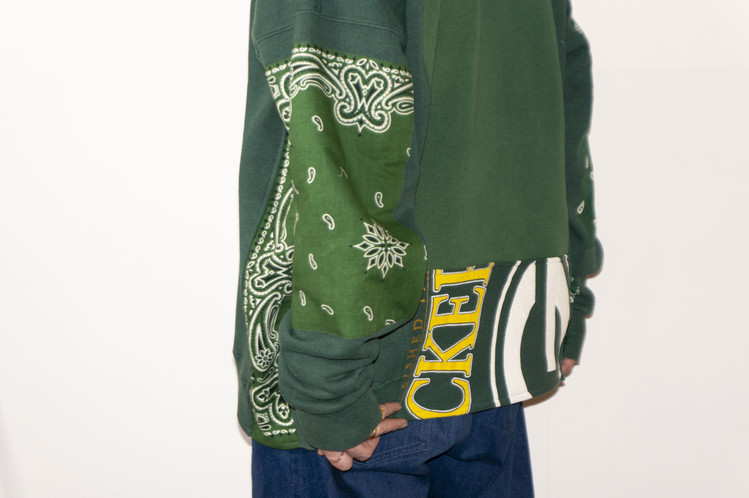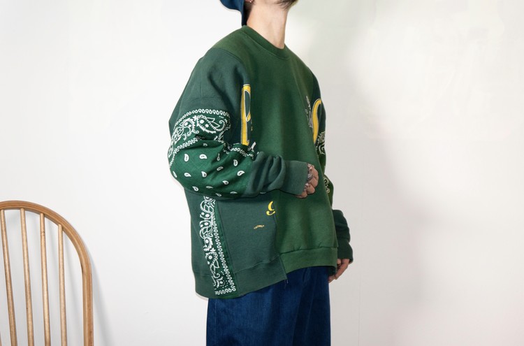 양쪽 소매에 넓게 패치워크 되어진 그린 색상의 반다나는 색상 톤의 차이와 다른 문양으로 자리에서 좋은 포인트를 보여주며, 옆을 채운 반다나는 움직임과 함께 보여질 부분 입니다. 뒤판의 길이감을 더한 프린팅이 있는 스웻셔츠의 조각으로 보다 좋은 균형감을 가지며, 여유로운 실루엣으로 입을 수 있는 하나의 옷으로 완성 되었습니다.