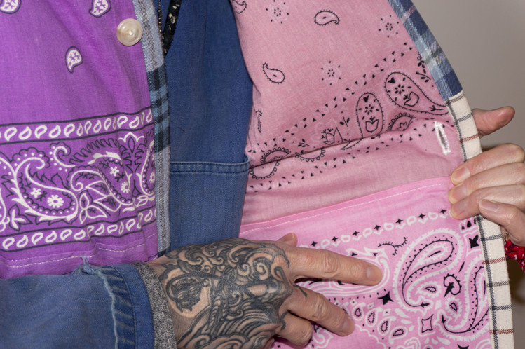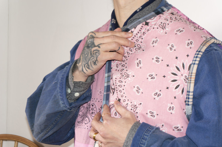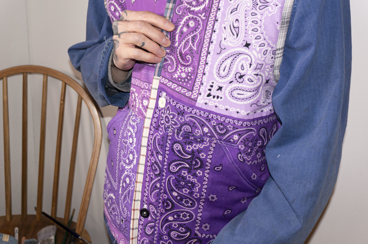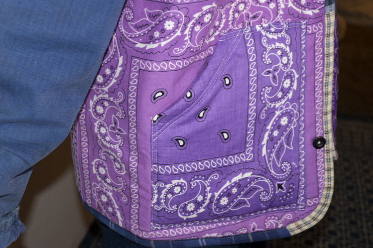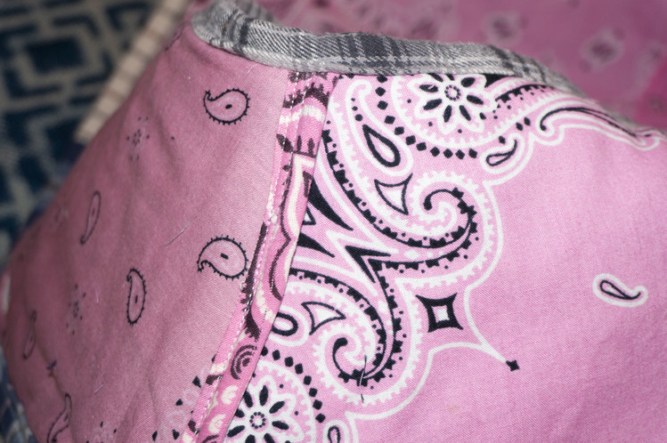 끝단은 모두 플란넬 셔츠의 조각들을 이용하여 반다나와 조화롭게 섞인 색상과 체크페턴의 모양을 확인할 수 있습니다. 단추 구멍의 작업 또한 수작업으로 진행된 정성스럽게 완성된 하나의 옷 입니다.