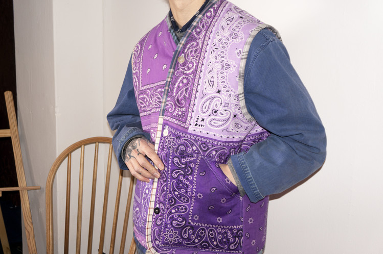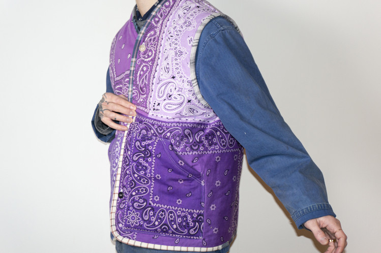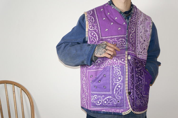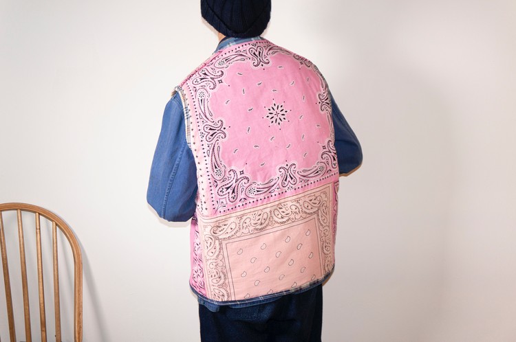 East oklm, The hand remake garments로 m65-liner의 소매부분을 해체하고 15장 이상의 빈티지 Fast color 반다나들을 믹스하여 앞뒤면을 모두 뒤집어 활용할 수 있는 Reversible 리메이크 Vest 상품.