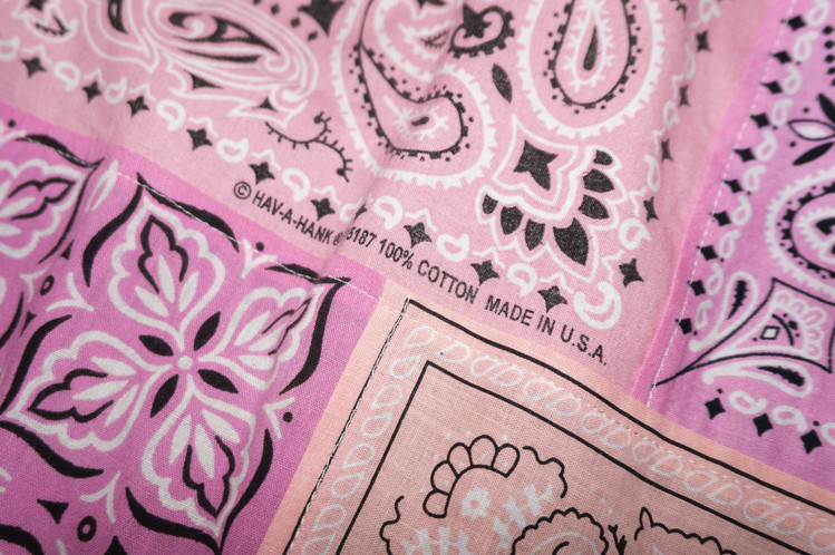 앞판은 퍼플, 뒤판은 핑크 컬러 위주의 Fast color 빈티지 반다나들을 재구성하여 다양한 문양과 색상의 톤이 섞일 수 있도록 하였으며, 앞판에 안정감있는 밀리터리 형태의 주머니를 만들어 안정감과 따뜻함을 더한 실용성을 보여 줍니다.
