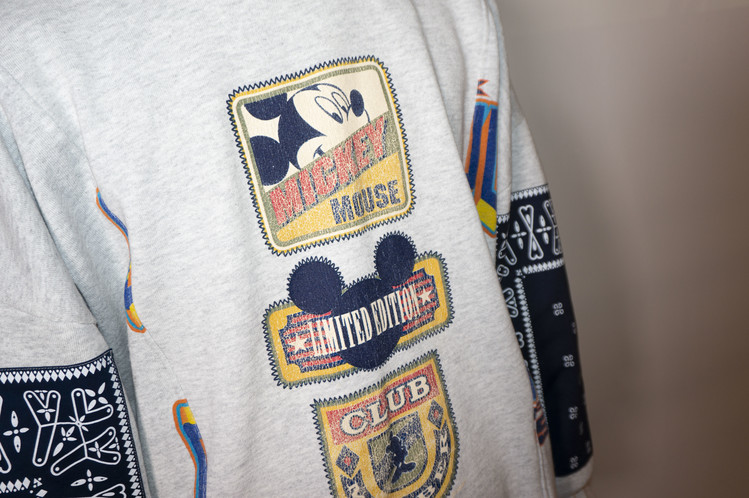 East oklm, The hand remake garments로 스웻셔츠들을 해체하고 재구성하여 반다나로 포인트를 만든 상품. 80’s ~90’s의 아메리칸 빈티지 스웻셔츠들 중 Disney의 미키 캐릭터와 NFL 프린팅이 있는 스웻셔츠들을 이용하여, 레트로한 프린팅의 조각이 연결되어 있는 표현을 볼 수 있습니다.