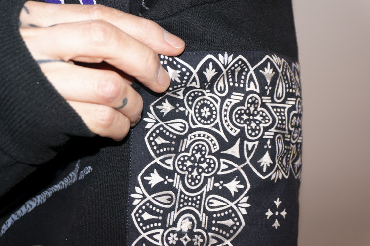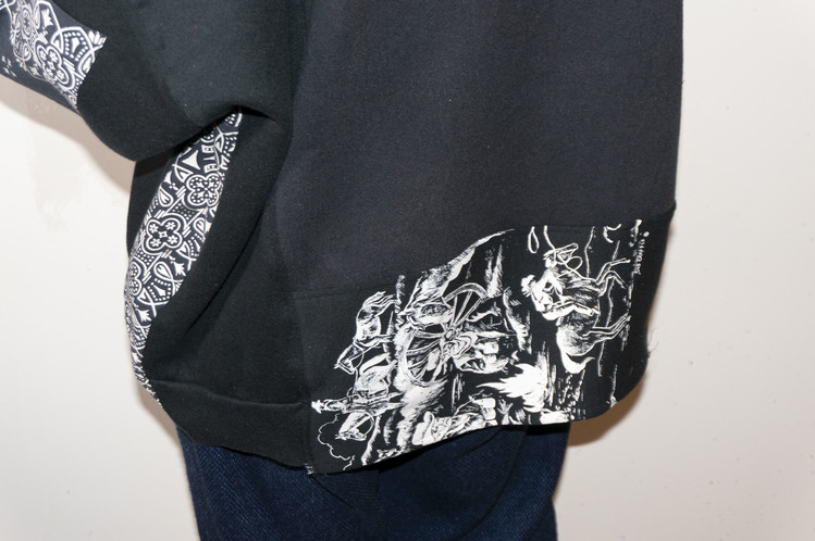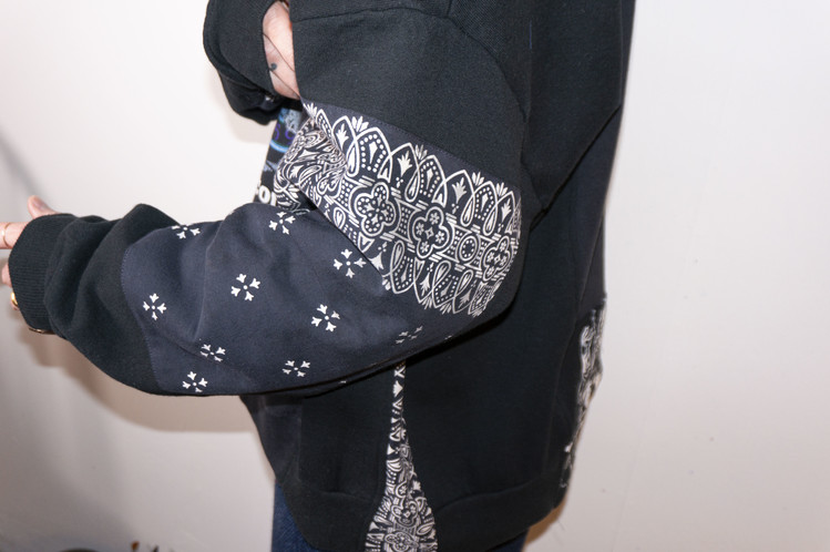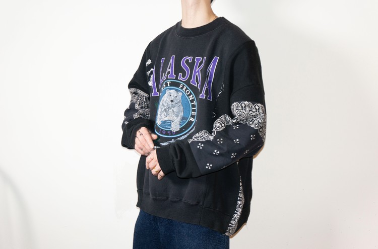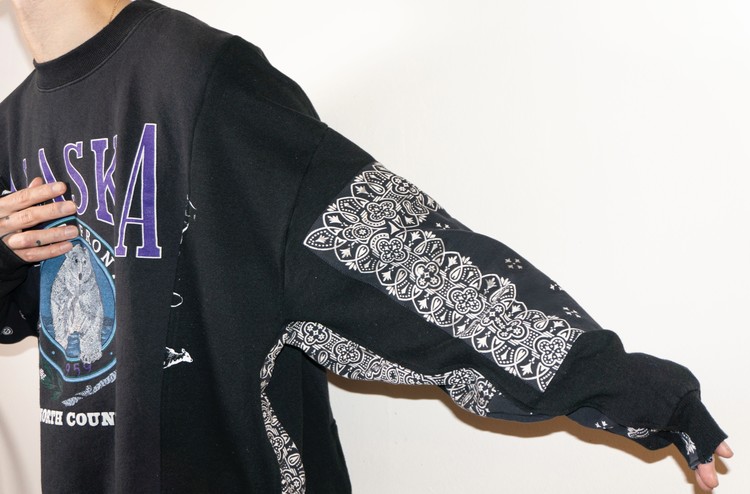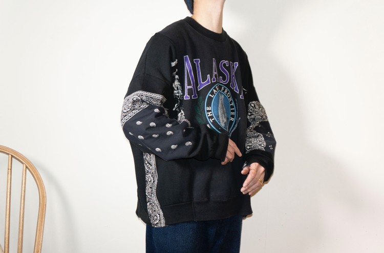 레트로한 프린팅들이 인상적인 블랙색상의 아메리칸 빈티지 스웻셔츠들을 믹스하여 프린팅의 조각이 연결된 부분들을 확인할 수 있으며, 양쪽 소매에 넓게 패치워크 되어진 블랙 색상의 Fast color 빈티지 반다나를 볼 수 있습니다.