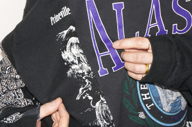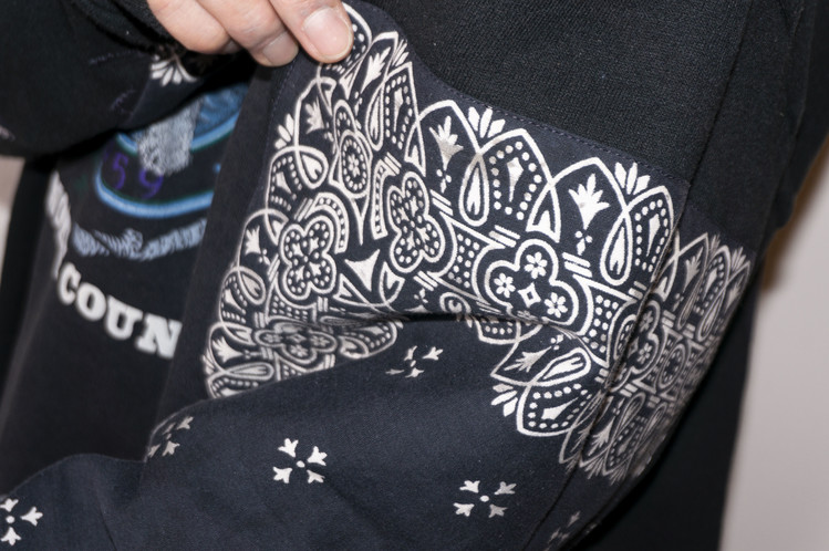 East oklm, The hand remake garments로 아메리칸 빈티지 스웻셔츠들을 해체하고 재구성하여 Fast color의 빈티지 반다나들로 포인트를 만든 상품.