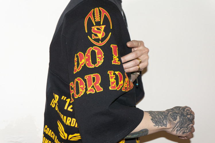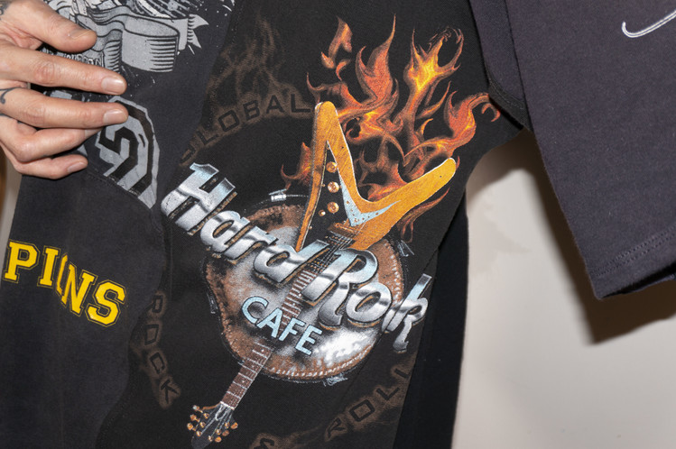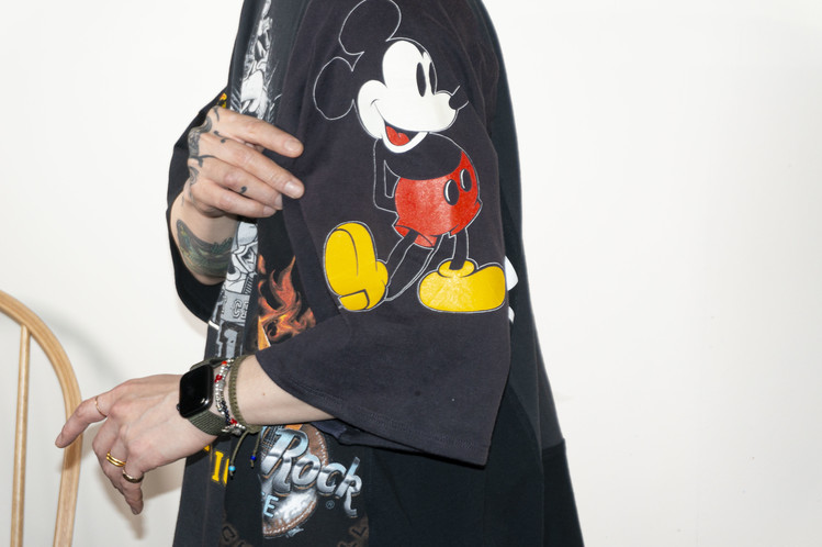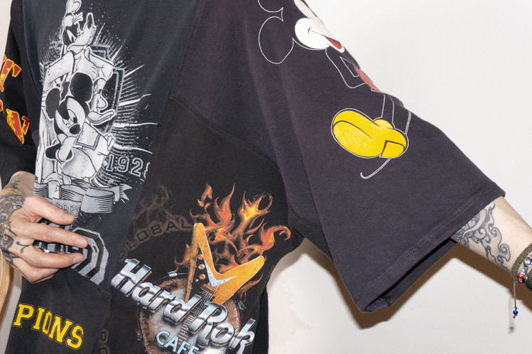 East oklm, The hand remake garments로 여러장의 빈티지 T-shirt 들을 해체하고 재구성하여 만들어진 믹스 티셔츠 상품. 80’s ~90’s의 미키 마우스를 비롯해 귀여운 디즈니 캐릭터들의 프린팅이 인상적이며, 아메리칸 빈티지 티셔츠들의 레트로한 프린팅 조각들의 구성을 확인할 수 있습니다.